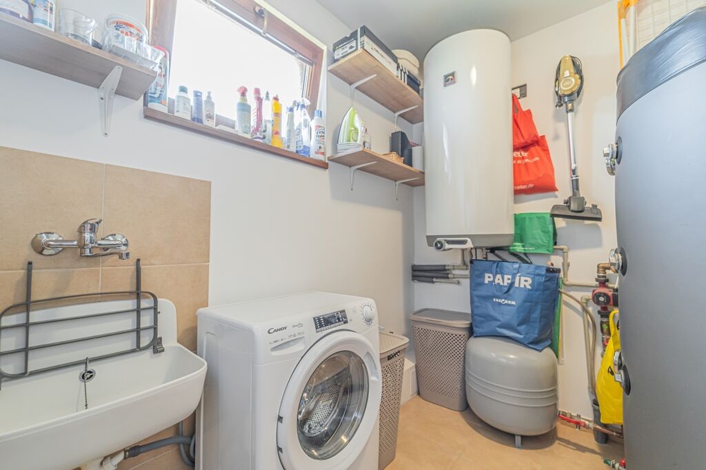 Vytápění domu zajišťuje elektrický kotel v kombinaci s krbovou vložkou s výměníkem, která je napojena na topný systém. V celém domě je instalováno podlahové vytápění s centrálním termostatem. Pro ohřev teplé vody slouží elektrický bojler značky Dražice s objemem 160 litrů. Technická místnost je vybavena výlevkou a podlahovým odtokem. Odpadní voda je svedena do tlakové kanalizace s přečerpávací jímkou.