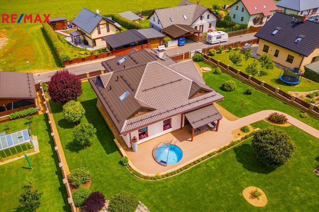 Představuji Vám do nejmenšího detailu promyšlený a špičkově udržovaný moderní dům na úpatí Krkonoš. Jedná se o prostorný, dvoupodlažní dům postavený ve vysokém standardu, který má užitnou plochu 232 m2 a patří k němu krásná udržovaná zahrada se zastřešenou terasou o výměře 1.183 m2. Dům se nachází v Držkově, jen kousek od centra města, a přitom v klidné rezidenční čtvrti, v těsné blízkosti přírody a běžeckých stop.