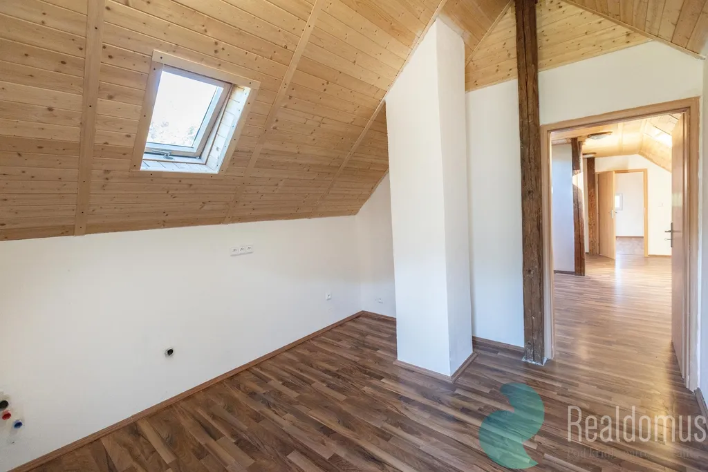 Po venkovních schodech vystoupáte do nově dokončeného obytného podkroví, kde najdete další kuchyňský kout, obývací pokoj, ložnici i koupelnu s vanou a WC – prostor perfektní pro rodinu nebo návštěvy.