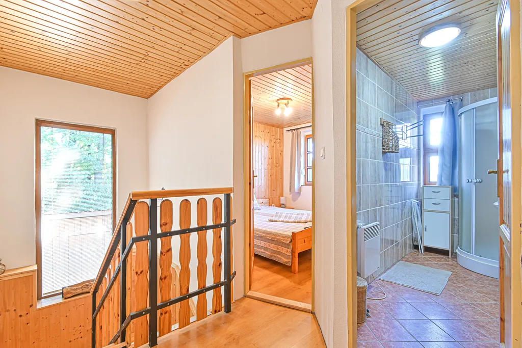 Interiér je laděný do příjemného dřevěného stylu a nabízí útulný obývací pokoj s krbem, plně vybavenou kuchyni, další dva pokoje a koupelnu se sprchovým koutem i pračkou. Toaleta je oddělena.
