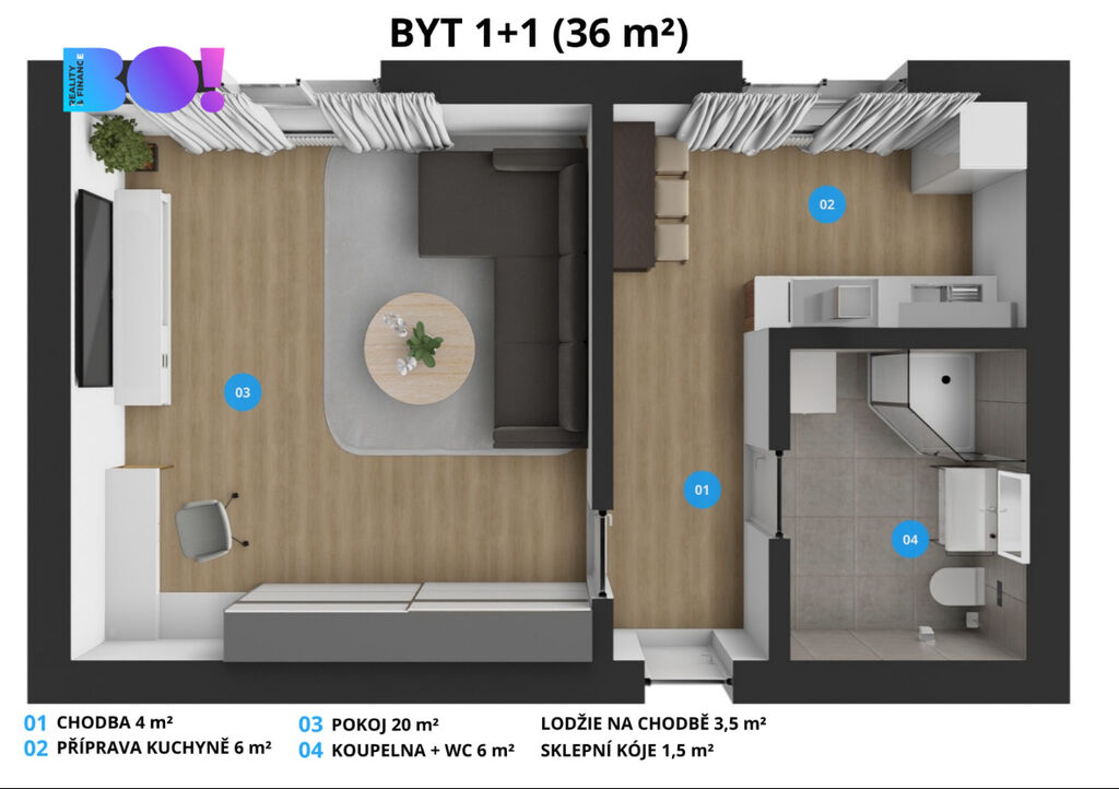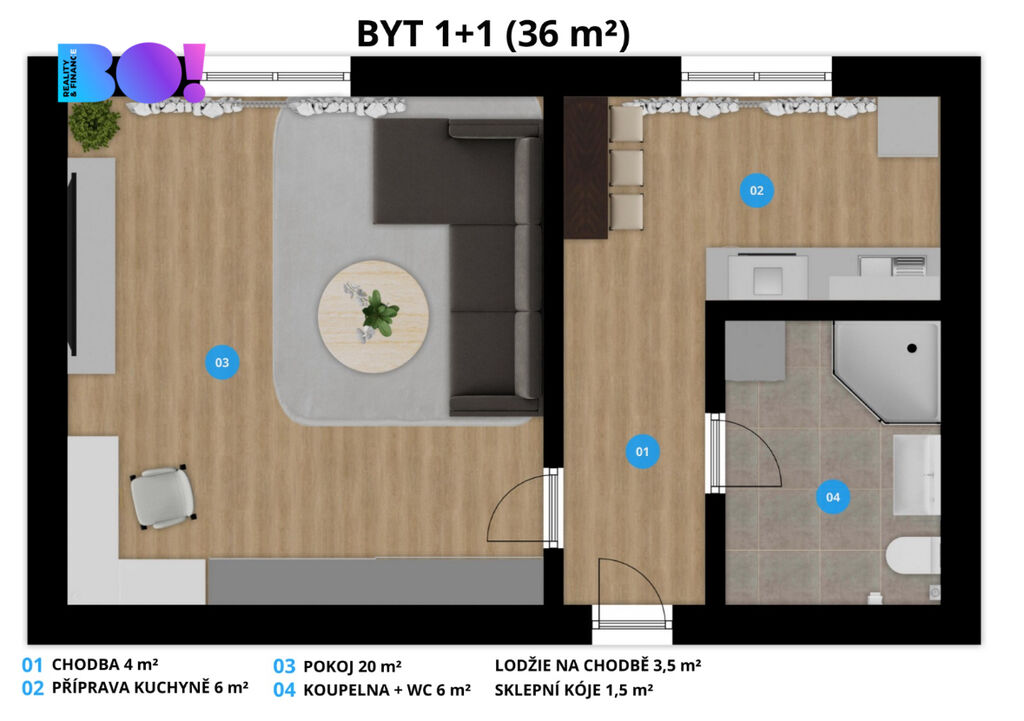 Celková užitná plocha činí 36 m² a k bytu náleží také prostorná lodžie (3 m²), která se nachází na patře, místo pro ranní kávu nebo večerní relaxaci a sklepní kóje (1,5 m²) pro úschovu vašich věcí.
