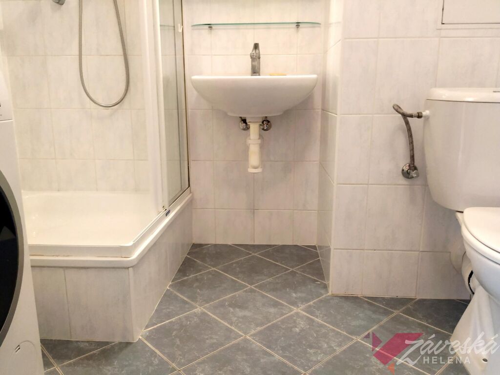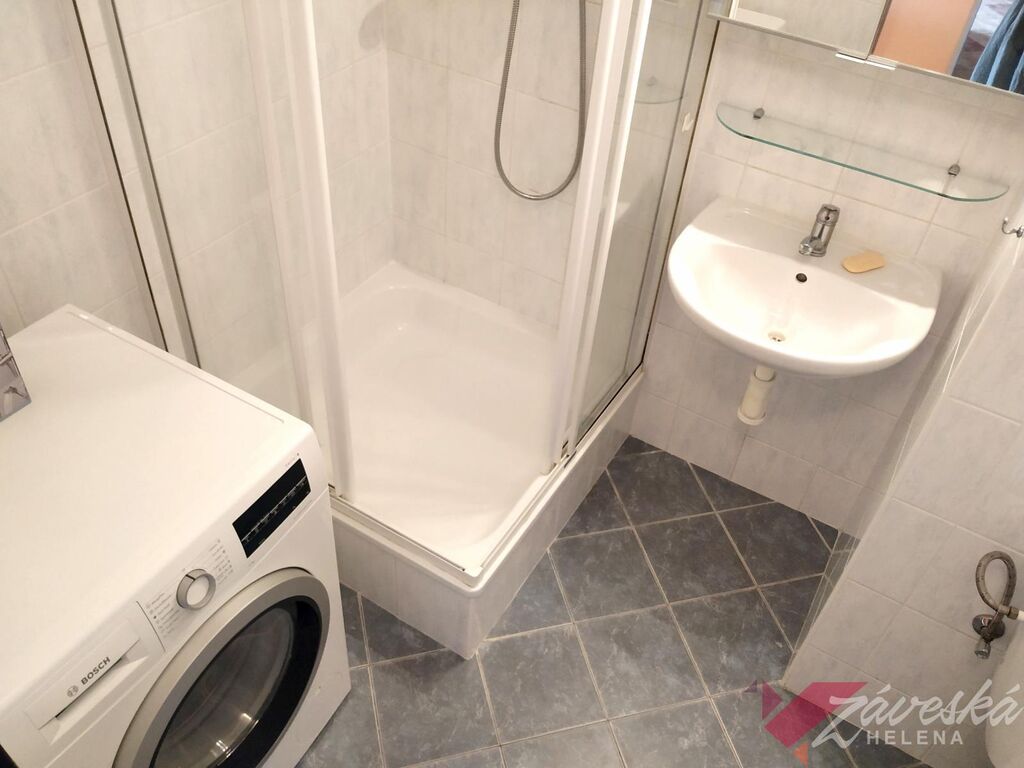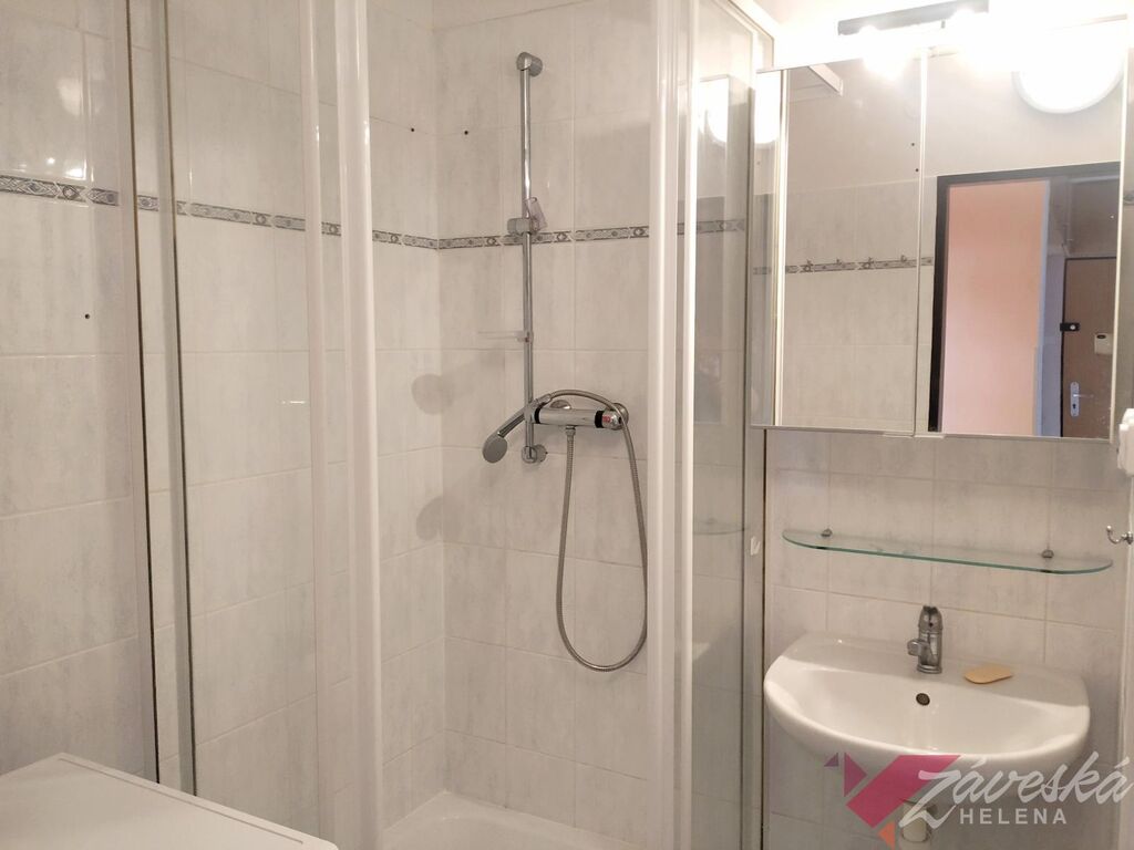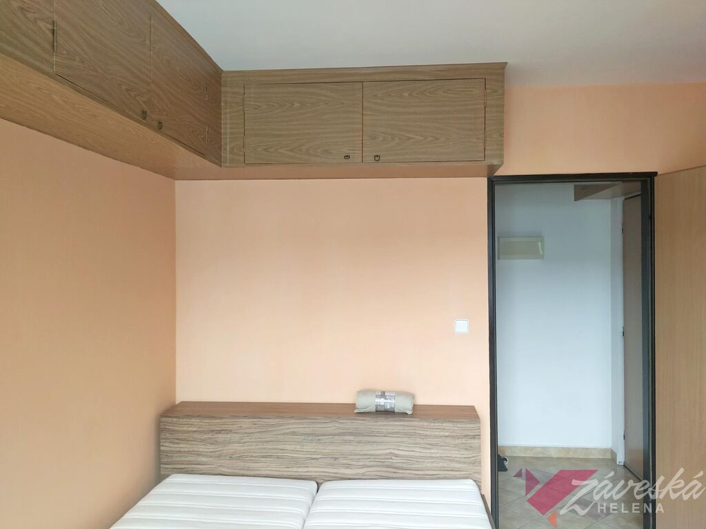 Vstoupíte do slunného bytu s kompletním vybavením. Prostorná kuchyňská linka s el. varnou sklokeramickou deskou a el. troubou, digestoř, myčka nádobí, rohový dřez, lednice s mrazákem, v celém bytě jsou instalována úsporná stropní svítidla a značné množství el. zásuvek, manželská postel, sedačka, jídelní stůl, 4 židle, kusový nábytek, skříně, komody, televizor, deskové radiátory, žaluzie, plastová okna s termosklem, nová podlahová krytina. Koupelna se sprchovým koutem, zrcadlo a osvětlení, toaleta, na podlaze keramická dlažba, bytová jednotka s opravdu velkokapacitními úložnými prostory, není pračka, nutno zajistit vlastní.