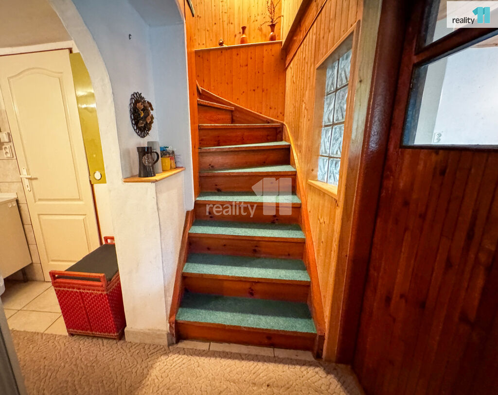 Podkroví: chodba s novým dřevěným obložením, vestavěnou skříní a posezením. Velký pokoj se čtyřmi lůžky (vytápění kamny Petra) s terasou s nádherným výhledem na přehradu a menší pokojík s palandou.