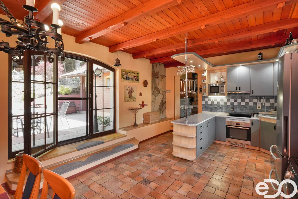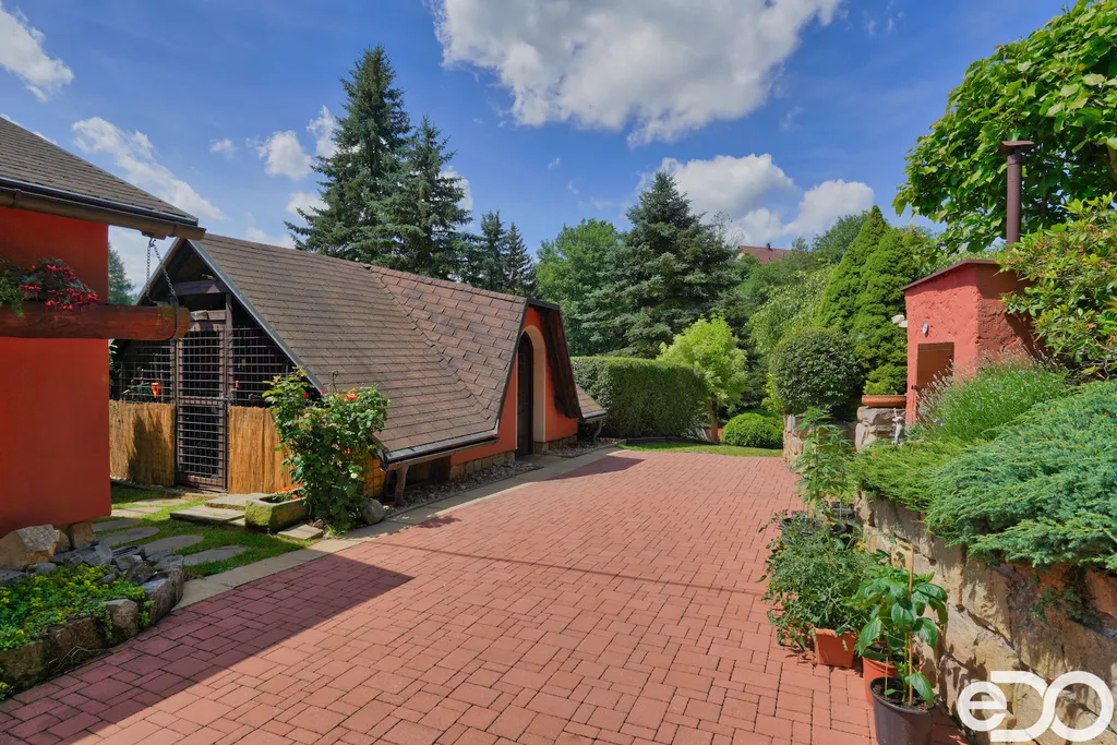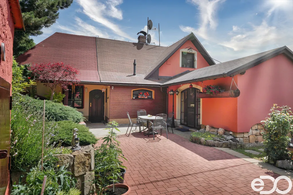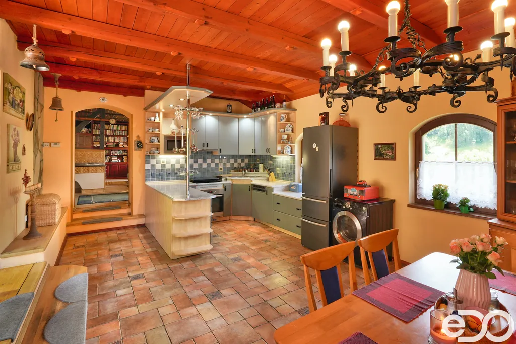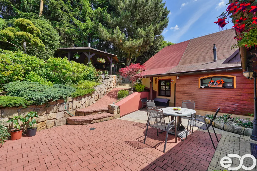 V exkluzivním zastoupení nabízím k prodeji rodinný dům umístěný v intravilánu obce Radeč nedaleko města Úpice. Ač se dům nachází nedaleko hlavní silnice, jeví se jako oáza klidu a pohody. Dům postaven ze základního stavebního materiálu a tím je kámen. Pevný, jistý a všestranný kámen vévodí v této nemovitosti obložením stavby. Stavba na bydlení a členitá zahrada-opečována pečlivou majitelkou. Vstupujeme branou na dálkové ovládání na příjezdové cestě, která vede do kopce až k obytné části domu. U kované brány je dvojitá garáž taktéž na dálkové ovládání - z toho vyplývá, že v zimním období není váš automobil pod obyčejným přístřeškem ale v teplotním komfortu. Travnaté plochy jsou pravidelně sekány a spojují několik odpočinkových a relaxačních zón. V pravo, cestou vedoucí za dům se nachází dřevník, sklad a plynová nádrž, která je jistotou nízkých nákladů na dům v zimním období. Na straně levé najdeme chodníky vedoucí k nejoblíbenější části celé nemovitosti-bazénu o hloubce 1.6m a délce 4m se stavbou pro pozvané hosty, kteří tu mohou i přespat. Dominantou této části je krásné jezírko s rybičkami. Vrátíme-li se od bazénu zpět k domu, potkáte cestou záhonky, tuje, smrkový porost, udírnu a dalším napojovacím chodníčkem se dostanete k luxusní pergole pro 10-20osob. Opačným směrem od bazénu se dostanete k dílně, která je obložená OSB deskami, skladem pro různá nářadí, která potřebujete nezbytně k udržování zahrady, bazénu a nakonec i domu. Hlavní budova kde jsou nejvíce obývané části a to kuchyně s podlahovým topením, obývací pokoj s velkou knihovnou a s krásným historický kachlovým krbem. Okna oblouková, dřevěné trámy na stropě, kovaný lustr jasně prozradí, že stojí za to tuto nemovitost vidět osobně! Z obývacího pokoje se dostanete na chodbu v nichž najdete koupelnu, masážní sprchový kout, záchod a úložný prostor. Po dřevěných schodech do patra najdete další 3 pokoje s krásnými výhledy do okolí! Toaletu a kancelář. Pokud vás nemovitost zaujala, zavolejte, myslím že na trhu se dlouho neohřeje!