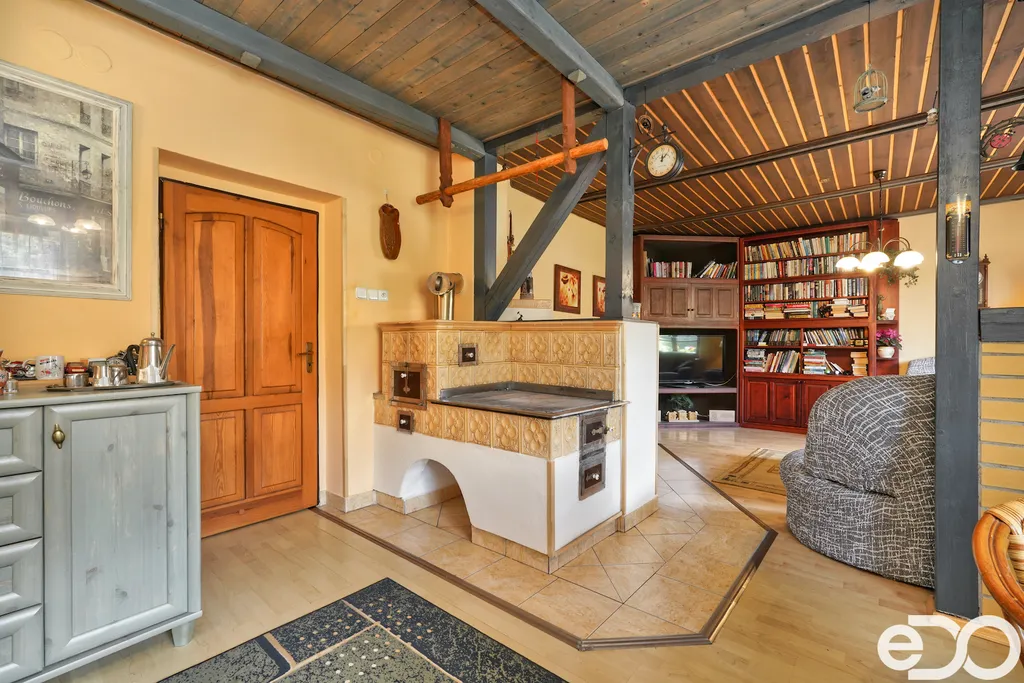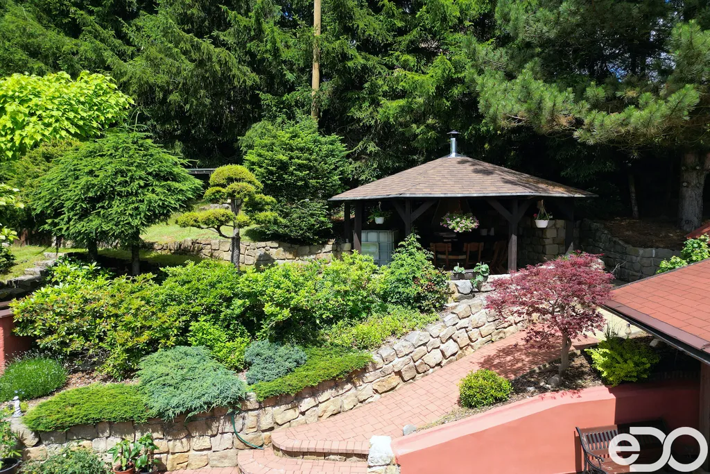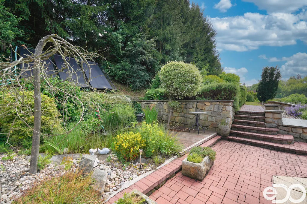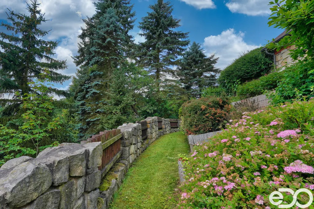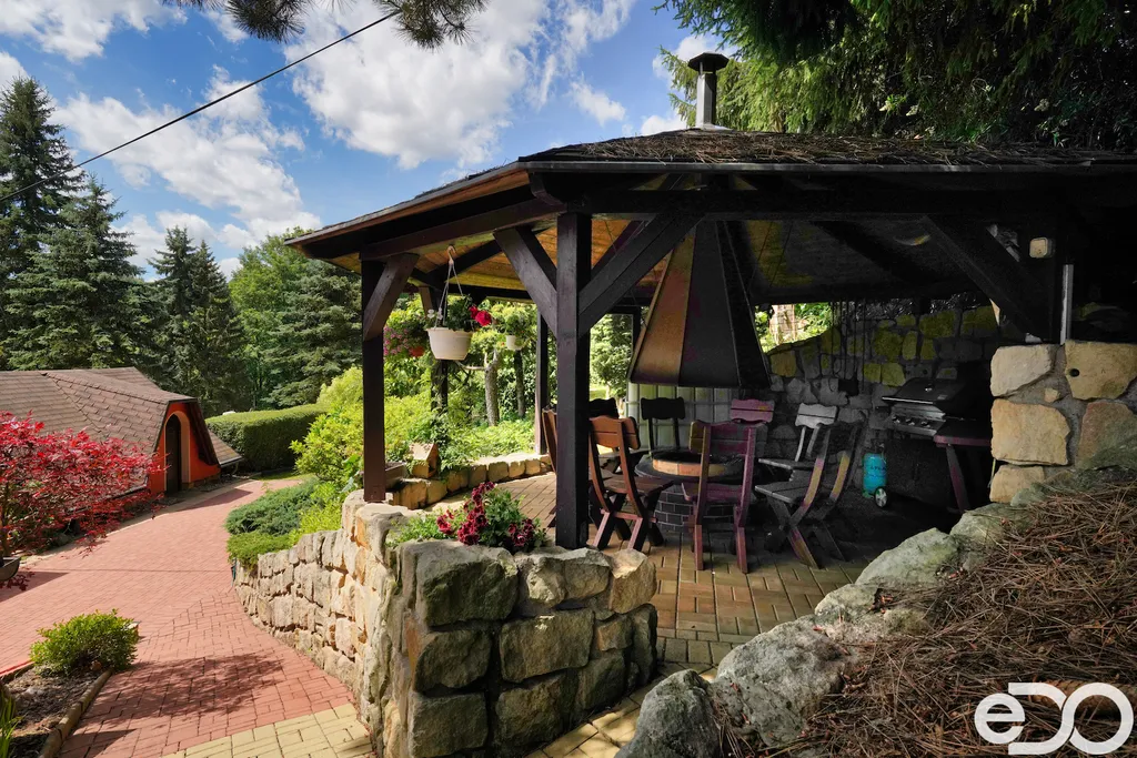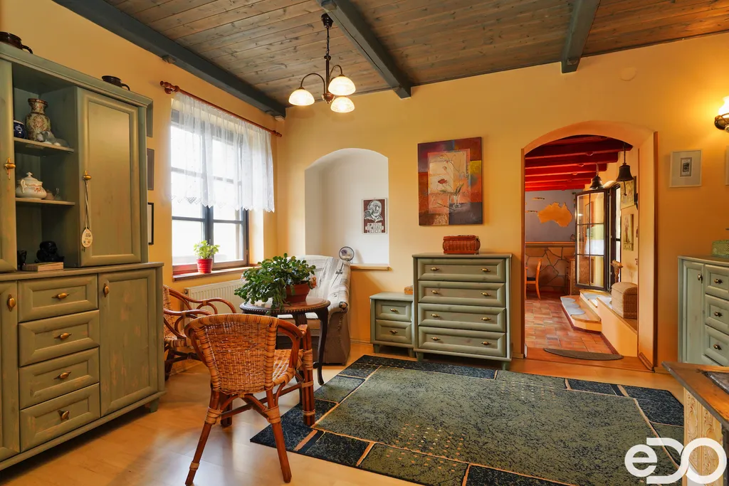 V exkluzivním zastoupení nabízím k prodeji rodinný dům umístěný v intravilánu obce Radeč nedaleko města Úpice. Ač se dům nachází nedaleko hlavní silnice, jeví se jako oáza klidu a pohody. Dům postaven ze základního stavebního materiálu a tím je kámen. Pevný, jistý a všestranný kámen vévodí v této nemovitosti obložením stavby. Stavba na bydlení a členitá zahrada-opečována pečlivou majitelkou. Vstupujeme branou na dálkové ovládání na příjezdové cestě, která vede do kopce až k obytné části domu. U kované brány je dvojitá garáž taktéž na dálkové ovládání - z toho vyplývá, že v zimním období není váš automobil pod obyčejným přístřeškem ale v teplotním komfortu. Travnaté plochy jsou pravidelně sekány a spojují několik odpočinkových a relaxačních zón. V pravo, cestou vedoucí za dům se nachází dřevník, sklad a plynová nádrž, která je jistotou nízkých nákladů na dům v zimním období. Na straně levé najdeme chodníky vedoucí k nejoblíbenější části celé nemovitosti-bazénu o hloubce 1.6m a délce 4m se stavbou pro pozvané hosty, kteří tu mohou i přespat. Dominantou této části je krásné jezírko s rybičkami. Vrátíme-li se od bazénu zpět k domu, potkáte cestou záhonky, tuje, smrkový porost, udírnu a dalším napojovacím chodníčkem se dostanete k luxusní pergole pro 10-20osob. Opačným směrem od bazénu se dostanete k dílně, která je obložená OSB deskami, skladem pro různá nářadí, která potřebujete nezbytně k udržování zahrady, bazénu a nakonec i domu. Hlavní budova kde jsou nejvíce obývané části a to kuchyně s podlahovým topením, obývací pokoj s velkou knihovnou a s krásným historický kachlovým krbem. Okna oblouková, dřevěné trámy na stropě, kovaný lustr jasně prozradí, že stojí za to tuto nemovitost vidět osobně! Z obývacího pokoje se dostanete na chodbu v nichž najdete koupelnu, masážní sprchový kout, záchod a úložný prostor. Po dřevěných schodech do patra najdete další 3 pokoje s krásnými výhledy do okolí! Toaletu a kancelář. Pokud vás nemovitost zaujala, zavolejte, myslím že na trhu se dlouho neohřeje!