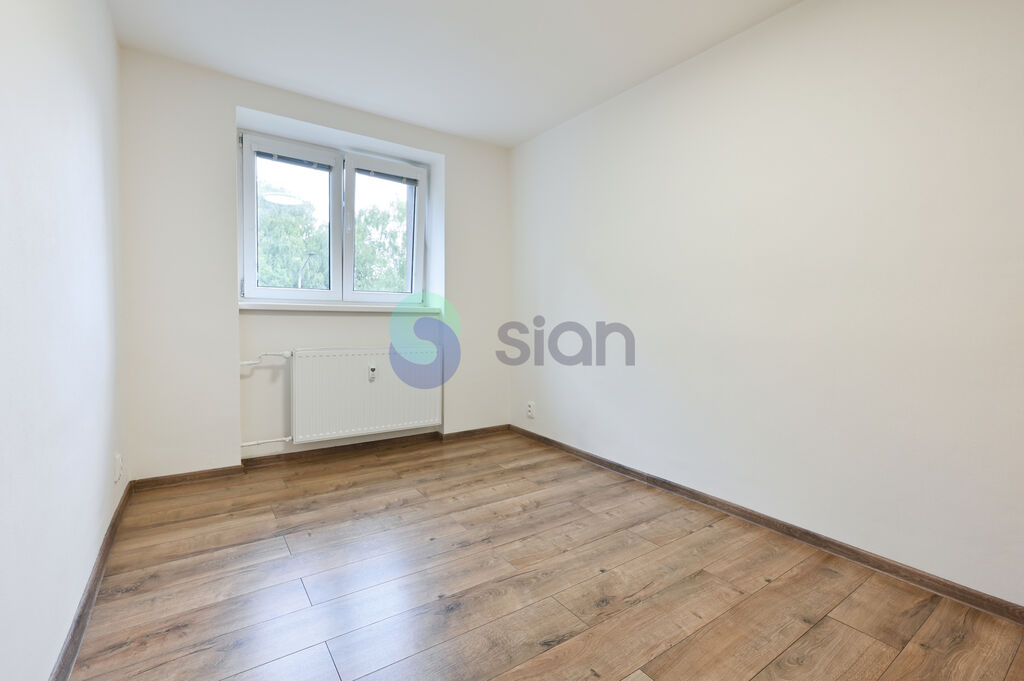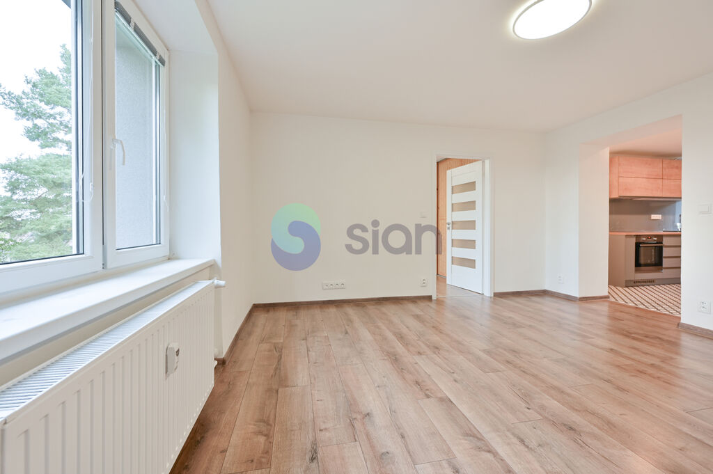 Byt byl po určitou dobu pronajímán, nyní je připraven k okamžitému nastěhování, i když si žádá několik drobných oprav. Dispozičně nabízí vedle kuchyně menší neprůchozí pokoj vhodný jako dětský pokoj nebo pracovna a prostorný obývací pokoj, který je průchozí do ložnice s výhledem do zeleně. Součástí bytu jsou také vestavěné skříně. Celkově působí interiér velmi světlým dojmem, a to i díky oknům orientovaným na dvě světové strany.