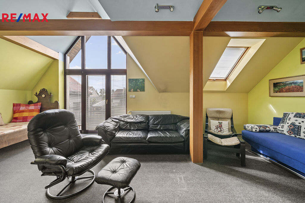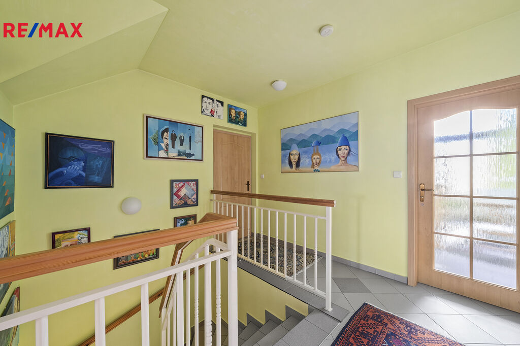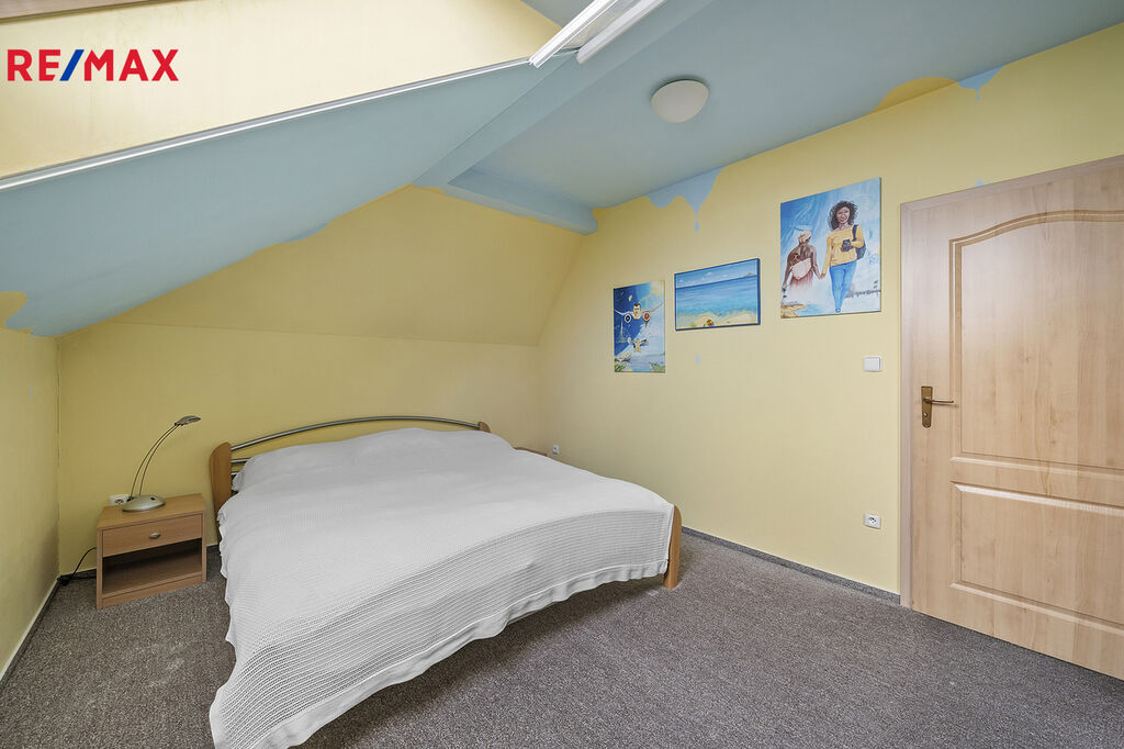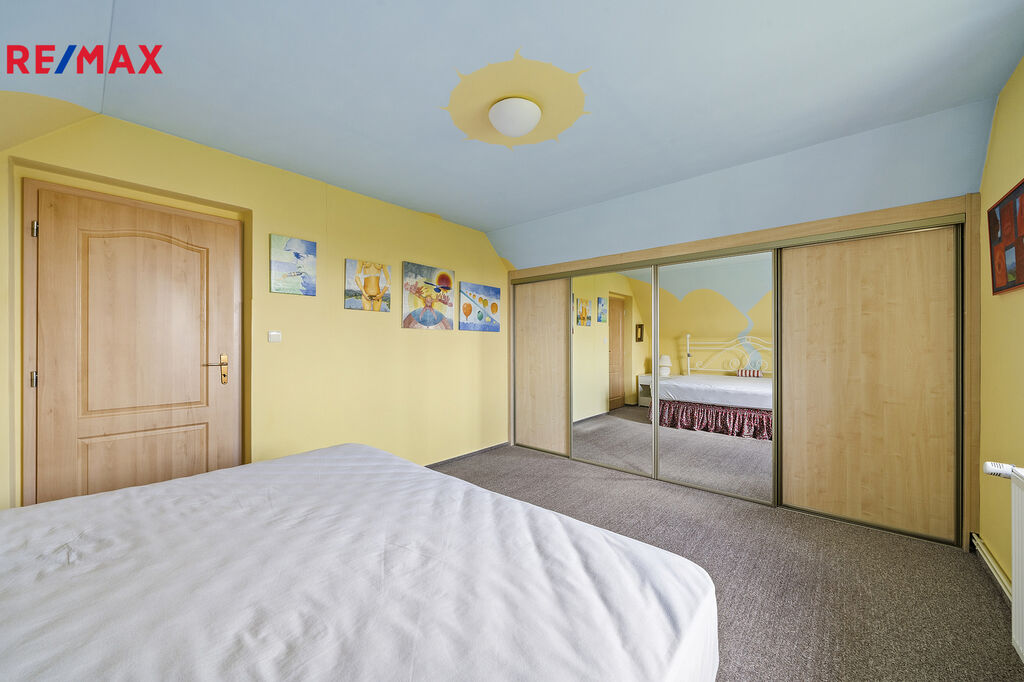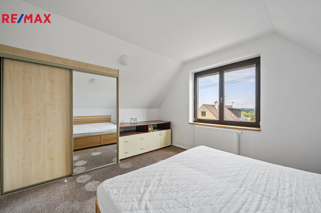 Ve druhém podlaží (cca 100 m2)je celkem 5 obytných místností a koupelna s toaletou a vanou. Pokoje jsou plnohodnotné s vysoko položenými pozednicemi. Největší z místností může sloužit jako obývací pokoj nebo herna pro děti. Tato místnost a pracovna jsou perfektně prosvětleny ve štítech velkoformátovými atypickými okny až ke hřebeni krovu. V několika místnostech jsou instalovány vestavěné skříně na míru poskytující dostatek úložných prostor. Na podlahách v přízemí jsou plovoucí podlahy a dlažba, v podkroví koberce. Při rekonstrukci kromě úprav interiéru (rozvody, koupelny, podlahy, interiérové dveře, systém vtápění atd..) byl obvodový plášť rodinného domu zateplen a bylo tak dosaženo energetické náročnosti budovy kategorie C. Uspořádání jednotlivých podlaží jsou věrně znázorněna na přiložených půdorysech, k dispozici i výkresy z projektové dokumentace. Rodinný dům je vybaven elektronickým zabezpečovacím zařízením. Parkování kromě garáže je možné i podél domu na vlastním pozemku na ploše zpevněné zámkovou dlažbou. Dům má skvělou orientaci na světové strany, na zahradě jsou vzrostlé stromy a kolna na nářadí.