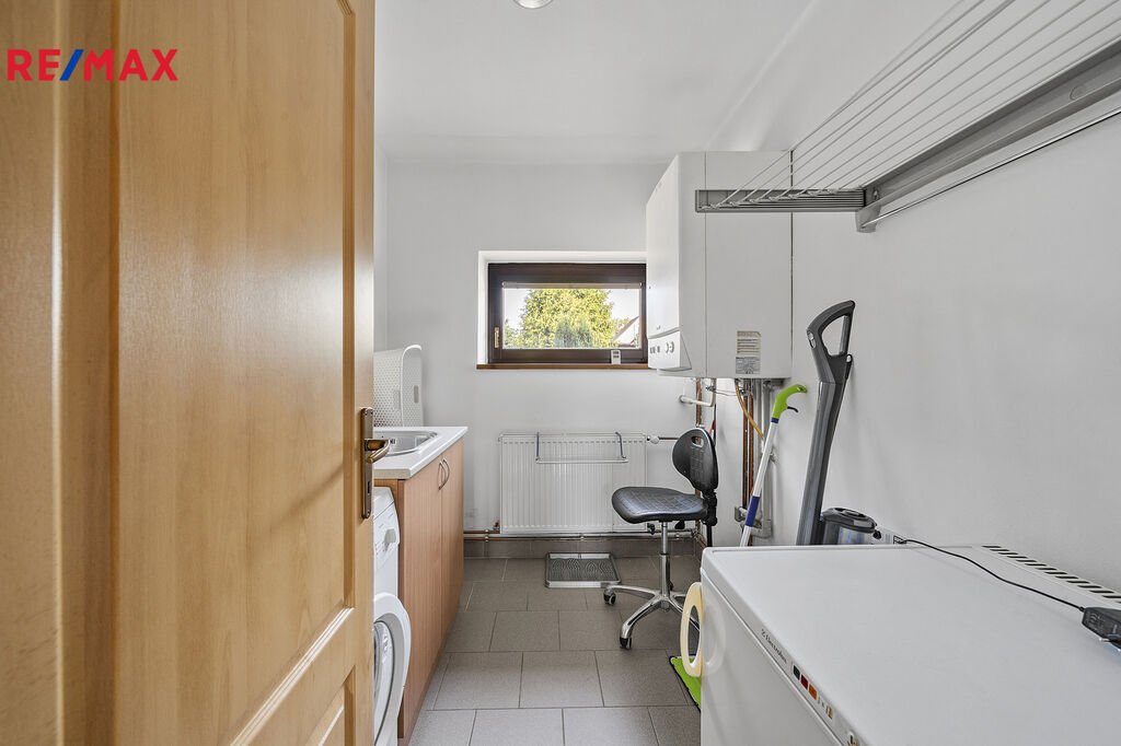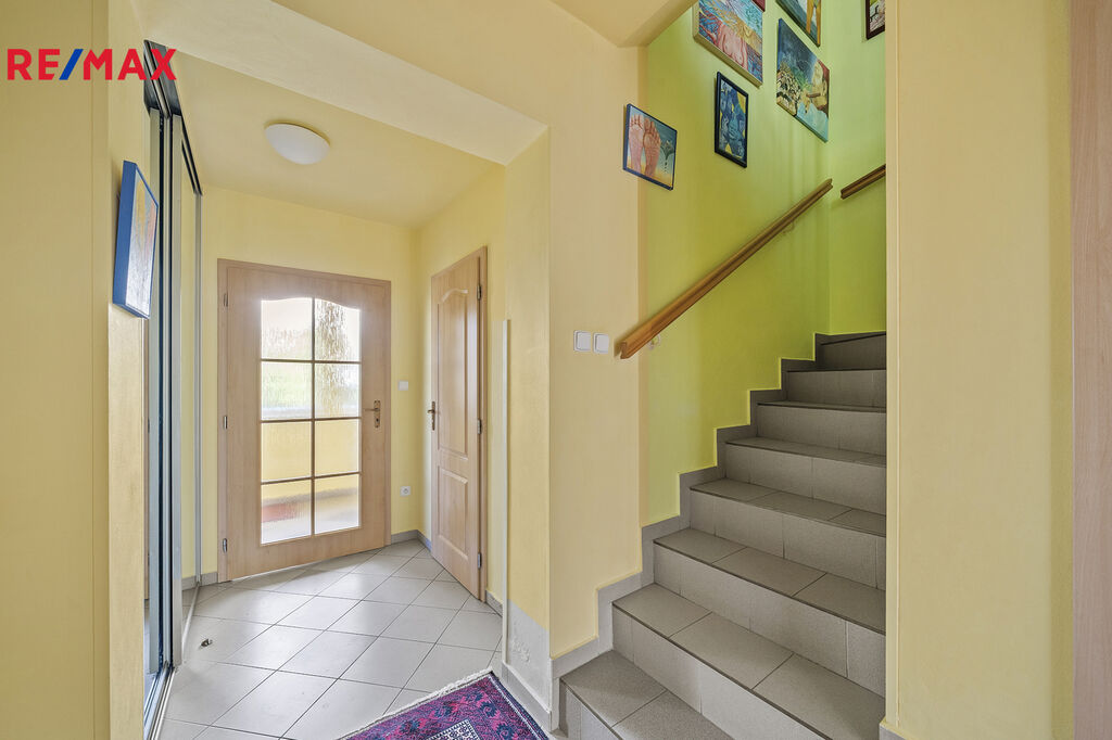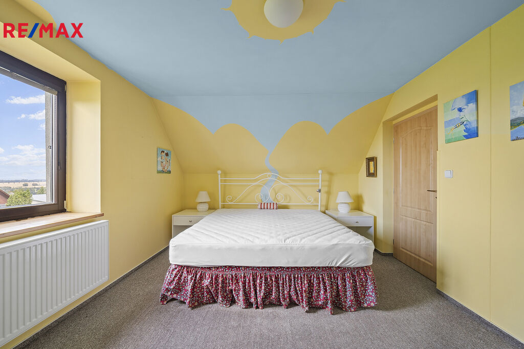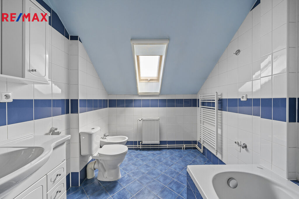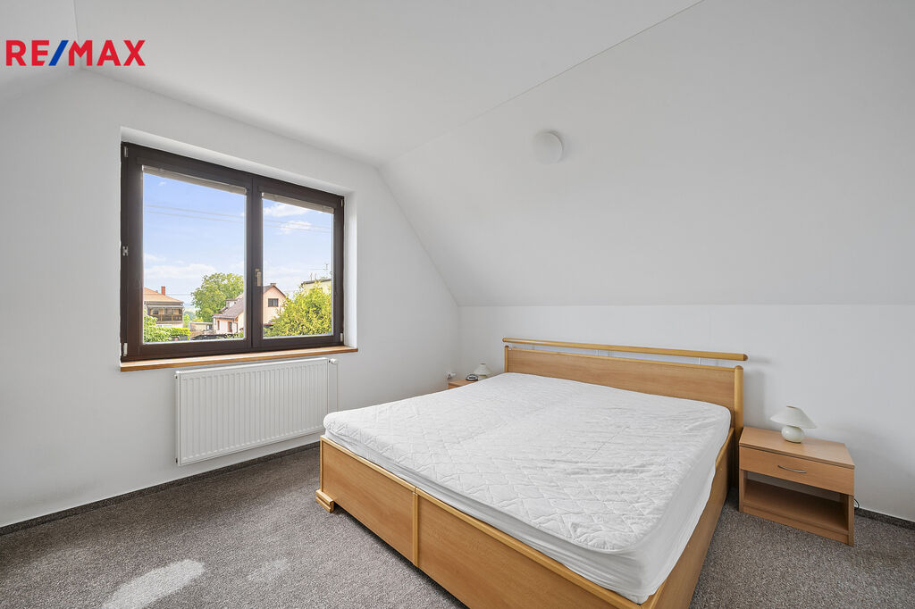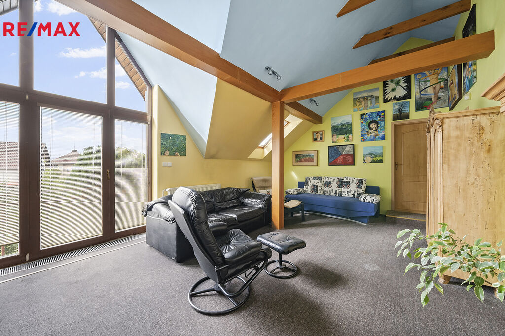 Ve druhém podlaží (cca 100 m2)je celkem 5 obytných místností a koupelna s toaletou a vanou. Pokoje jsou plnohodnotné s vysoko položenými pozednicemi. Největší z místností může sloužit jako obývací pokoj nebo herna pro děti. Tato místnost a pracovna jsou perfektně prosvětleny ve štítech velkoformátovými atypickými okny až ke hřebeni krovu. V několika místnostech jsou instalovány vestavěné skříně na míru poskytující dostatek úložných prostor. Na podlahách v přízemí jsou plovoucí podlahy a dlažba, v podkroví koberce. Při rekonstrukci kromě úprav interiéru (rozvody, koupelny, podlahy, interiérové dveře, systém vtápění atd..) byl obvodový plášť rodinného domu zateplen a bylo tak dosaženo energetické náročnosti budovy kategorie C. Uspořádání jednotlivých podlaží jsou věrně znázorněna na přiložených půdorysech, k dispozici i výkresy z projektové dokumentace. Rodinný dům je vybaven elektronickým zabezpečovacím zařízením. Parkování kromě garáže je možné i podél domu na vlastním pozemku na ploše zpevněné zámkovou dlažbou. Dům má skvělou orientaci na světové strany, na zahradě jsou vzrostlé stromy a kolna na nářadí.
