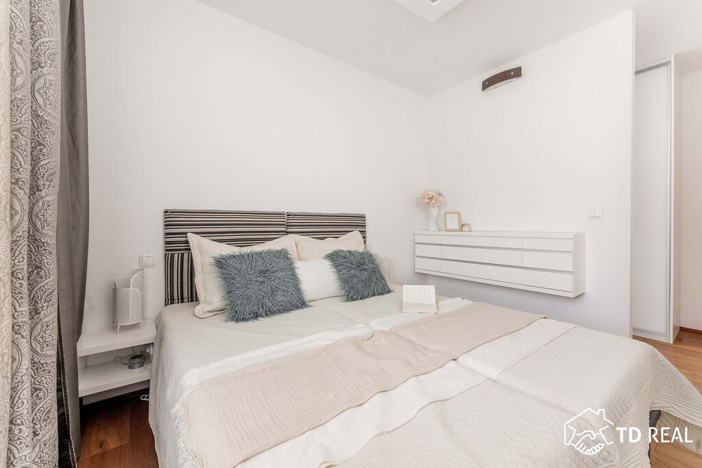 Hlavním lákadlem tohoto bytu je velký slunný obývací pokoj s nádherným výhledem přímo na terasu. Moderní kuchyně je vybavena luxusní corianovou pracovní deskou a vestavěnými spotřebiči, které splní i ty nejnáročnější požadavky.