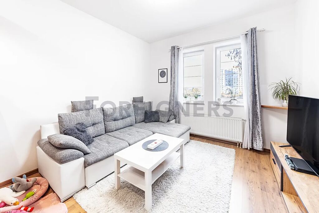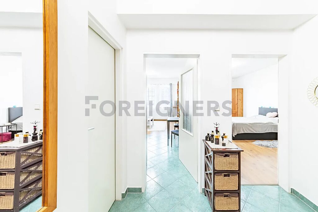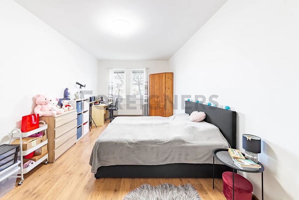 Byt se stává s chodby s šatnou (7,36 m2), koupelny (4,73 m2) s vanou a pračkou, samostatné WC (2,64 m2), ložnice (20,2 m2) s šatní skříní a kuchyně (20,06 m2) s kuchyňskou linkou včetně spotřebičů.Byt se nachází v přízemí cihlového domu s orientací na jihozápad.Byt je zcela vybavený. K bytu náleží zděný sklad na patře.Skvělá dostupnost v docházkové vzdálenosti MHD.