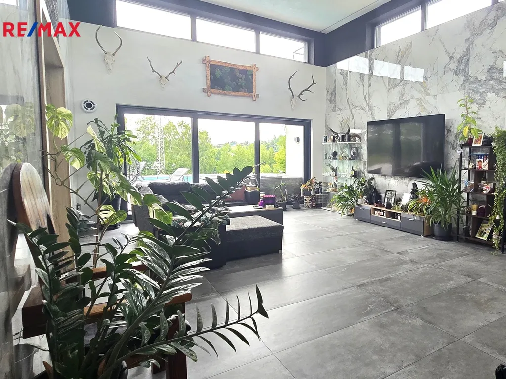 Nemovitost se skládá ze 3 prostorných pokojů s vlastní šatnou, netradičně vyvýšeným obývacím pokojem se světlou výškou 5 m, 2 koupelnami, 3 WC, kuchyní s jídelnou a barem, spížkou a 2 technickými místnostmi. Dvojgaráž se vstupem přímo do domu, v současnosti využita jako posilovna pána domu, je další výhodou této nemovitosti.