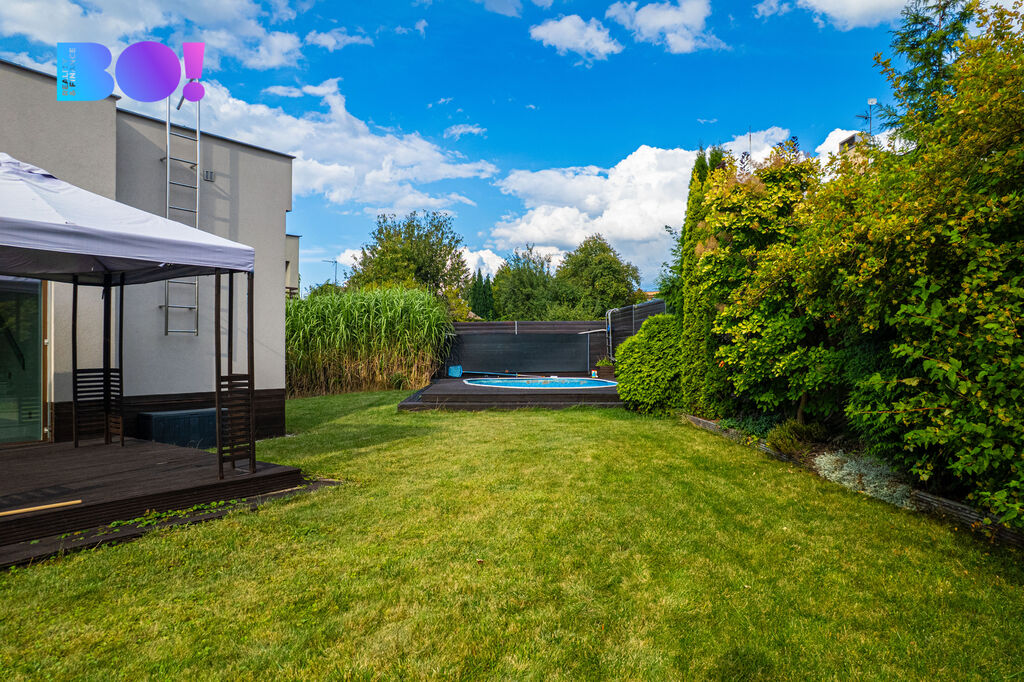 Exteriér domu zdobí nová fasáda, kryté parkovací stání, bazén a zahrada, která je nenáročná na údržbu. Díky tomu si tu budete užívat spíše odpočinek a společné chvíle u bazénu, než nekonečné hodiny práce.