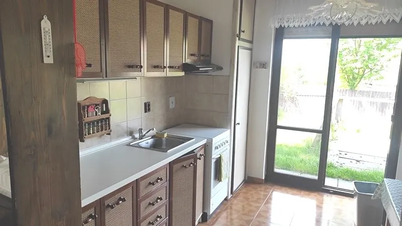 1. NP - terasa 23 m2, vstupní hala se schodištěm 12 m2, kuchyně (sever)10 m2, obývací pokoj s krbem (jih) 32 m2, ložnice (sever) 15 m2, koupelna 8 m2, samostatné wc. Obývací pokoj i kuchyně disponují samostatnými vstupy do zahrady.