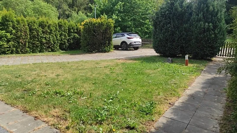 Pozemek okolo nemovitosti je rovinatý, zatravněný bez pěstebních záhonů s dokončenými spojovacími cestami (příjezd, stání, chodník...).