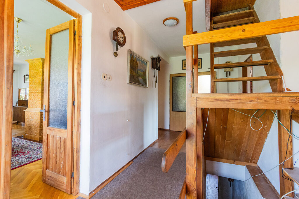 Dům má dvě patra, je zasazen do svahu a má horní a spodní podlaží. Patra mohou velmi dobře fungovat jako dva samostatné byty – spodní má totiž vlastní vchod. Dokážu si zde představit třeba i dvě rodiny nebo variantu s pronájmem. Dům má navíc půdu s vyvedeným topením – tedy připravený prostor pro další rozšíření. Potěší i 18 m² klenutý sklep.