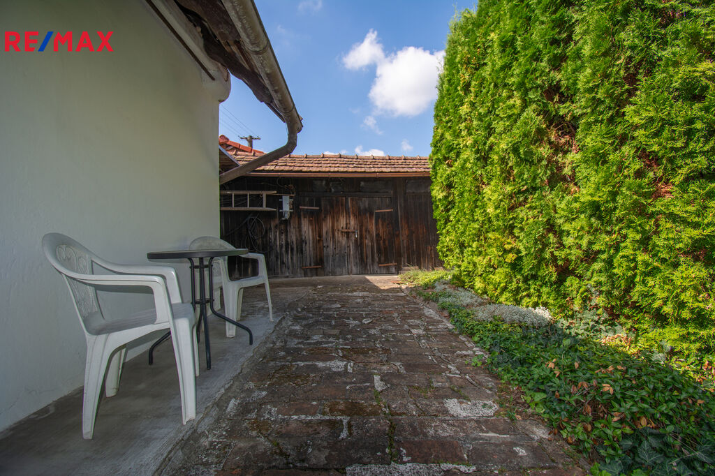 Pozemek a technické zázemí nemovitosti je napojené na obecní vodovod, kanalizaci, plyn i elektřinu. Na pozemku se nachází také studna a větší dřevěná kůlna. Menší zahrada je osázena vzrostlými thujemi, které zajišťují soukromí. Přístup na pozemek je možný brankou pro pěší nebo vjezdem pro auto. Před domem je pozemek s věcným břemenem chůze a jízdy pro zajištění přístupu k nemovitosti. Vedle domu je zbudované nové menší parkoviště. Ulice je jinak slepá (neprůjezdná) a díky tomu je zde klid.