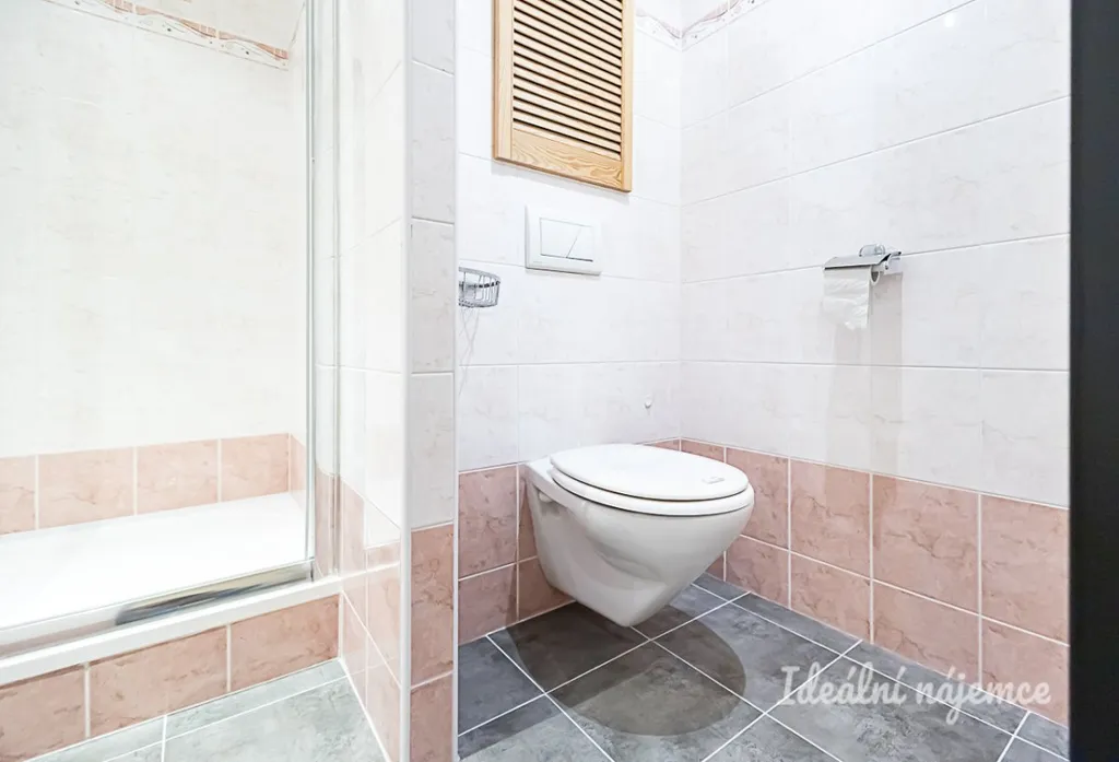 Samostatný pokoj je vhodný jako ložnice. Koupelna disponuje sprchovým koutem, umyvadlem, koupelnovou skříňkou a toaletou.