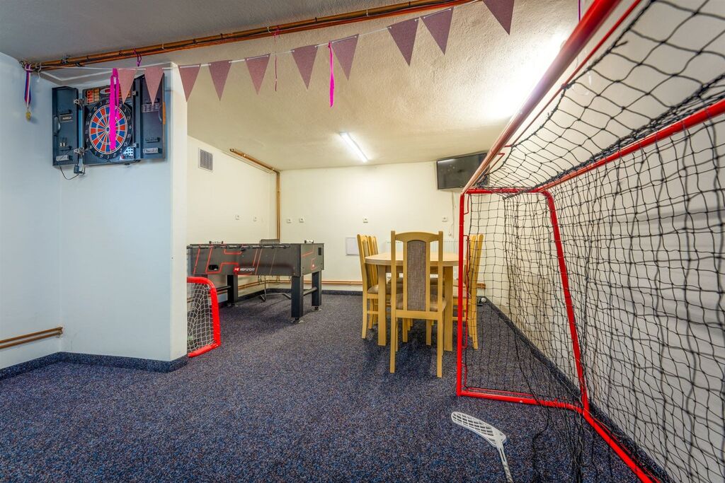 Další praktické prostory nalezneme v suterénu domu, kde je k dispozici společenská místnost, kuchyňský kout se zázemím pro pračku a sušičku, samostatná toaleta, posilovna, dílna a technická místnost.