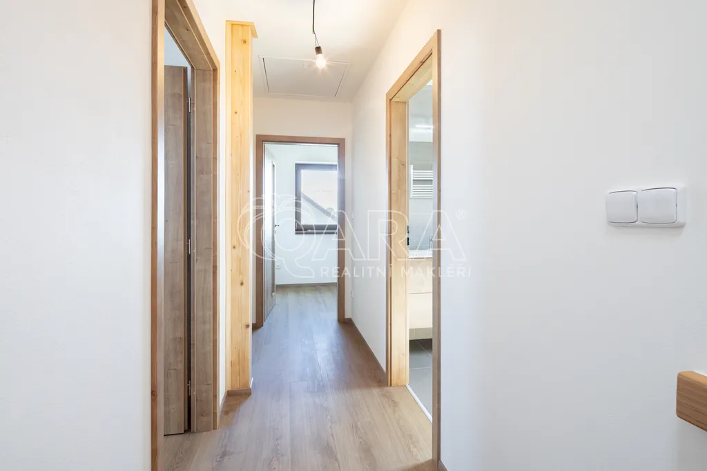 Dům o dvou podlažích (1. NP 54 m², 2. NP 50 m²) je dispozičně řešen jako 4+kk, přičemž v přízemí se nachází společenská zóna: obývací pokoj s kuchyňským koutem, předsíň, samostatné WC a technická místnost. V patře jsou tři samostatné ložnice a velkorysá koupelna se sprchovým koutem (v koupelně je také skrytá příprava pro vanu) a s WC. Téměř v celém domě je položena rigidní vinylová podlaha, v předsíni, technické místnosti a v koupelně je dlažba. V půdním prostoru je vytvořena pochozí půda o velikosti cca 25 m² k ukládání sezónních věcí.