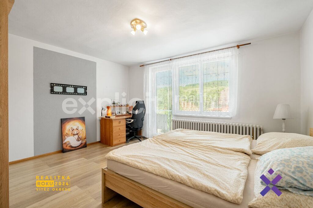 V patře se nachází samostatná kuchyně s jídelnou a vstupem na balkon, prostorný obývací pokoj s lodžií, ložnice s vlastní lodžií, dětský pokoj, koupelna a samostatné WC. V přízemí je k dispozici další pokoj vhodný jako pracovna nebo pokoj pro hosty, dále kotelna, koupelna s prádelnou a praktické skladové i menší sklepní prostory.