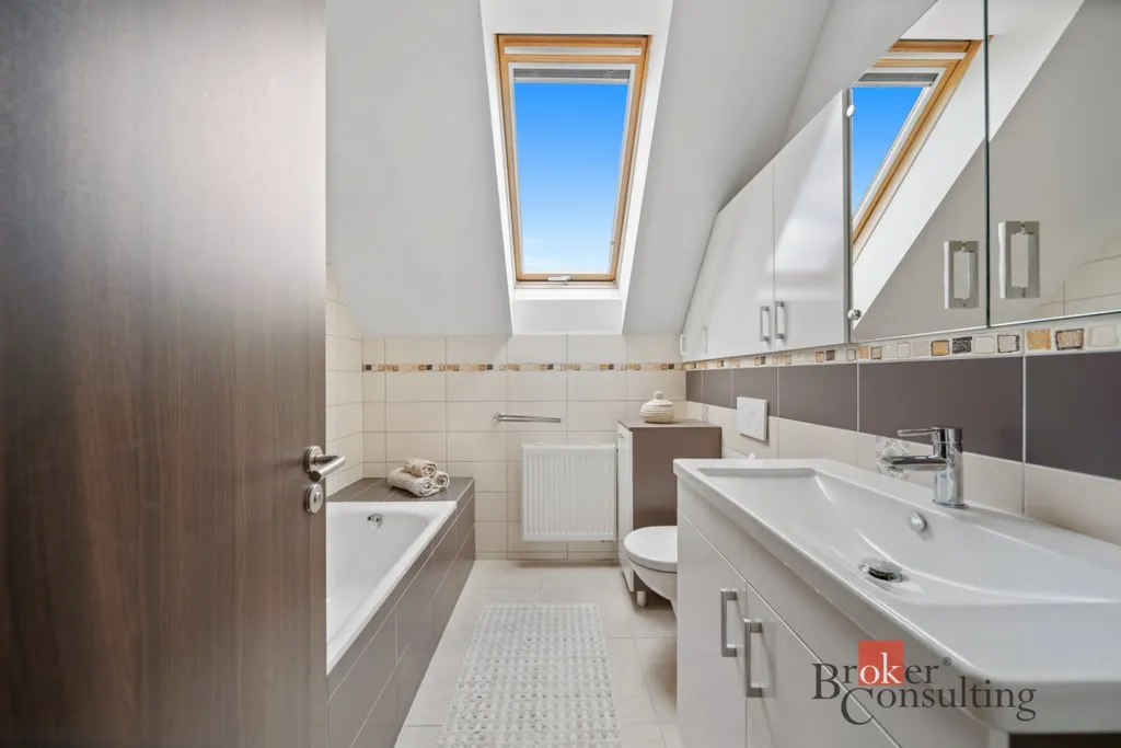 Dům je napojen na všechny inženýrské sítě – elektřinu, plyn, vodu i kanalizaci. Vytápění zajišťuje kondenzační kotel se zásobníkem TUV. V koupelnách najdete vanu, sprchový kout, tři umyvadla a tři závěsné WC.