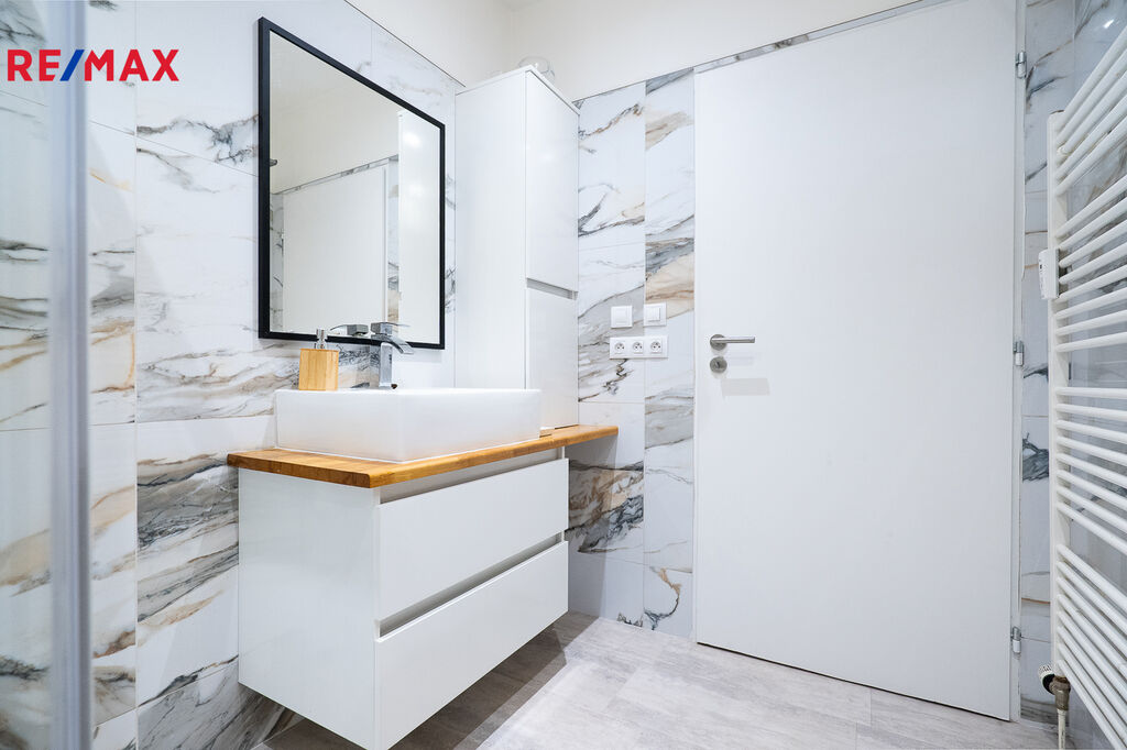 Byt je situován v prvním podlaží a v podkroví.  Přístup vede přes schodiště a zastřešenou pavlač, vstup vede z předsíně dok prostorné obývací místnosti (24,96 m²)  spojené s kuchyní (11,5 m²) s oknem a novou kuchyňskou linkou (r. 2017) kompletně vybavenou spotřebiči. Na tomto podlaží se nachází ještě prostorná šatna (10 m2)  a ložnice (14,78 m2). Komfort poskytuje moderní koupelna se sprchovým koutem, umyvadlem, vestavěným nábytkem a infrasaunou.