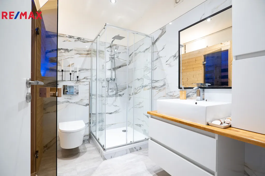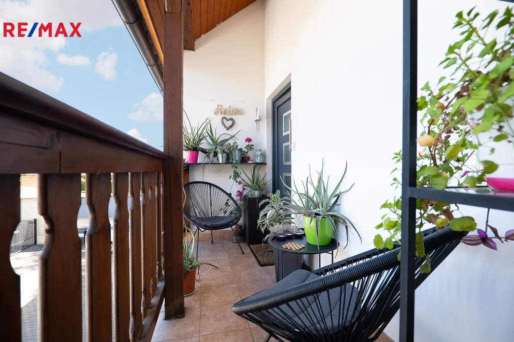 Byt je situován v prvním podlaží a v podkroví. Přístup vede přes schodiště a zastřešenou pavlač, vstup vede z předsíně dok prostorné obývací místnosti (24,96 m²) spojené s kuchyní (11,5 m²) s oknem a novou kuchyňskou linkou (r. 2017) kompletně vybavenou spotřebiči. Na tomto podlaží se nachází ještě prostorná šatna (10 m2) a ložnice (14,78 m2). Komfort poskytuje moderní koupelna se sprchovým koutem, umyvadlem, vestavěným nábytkem a infrasaunou.