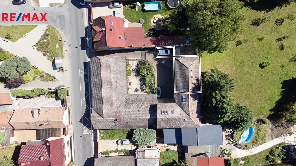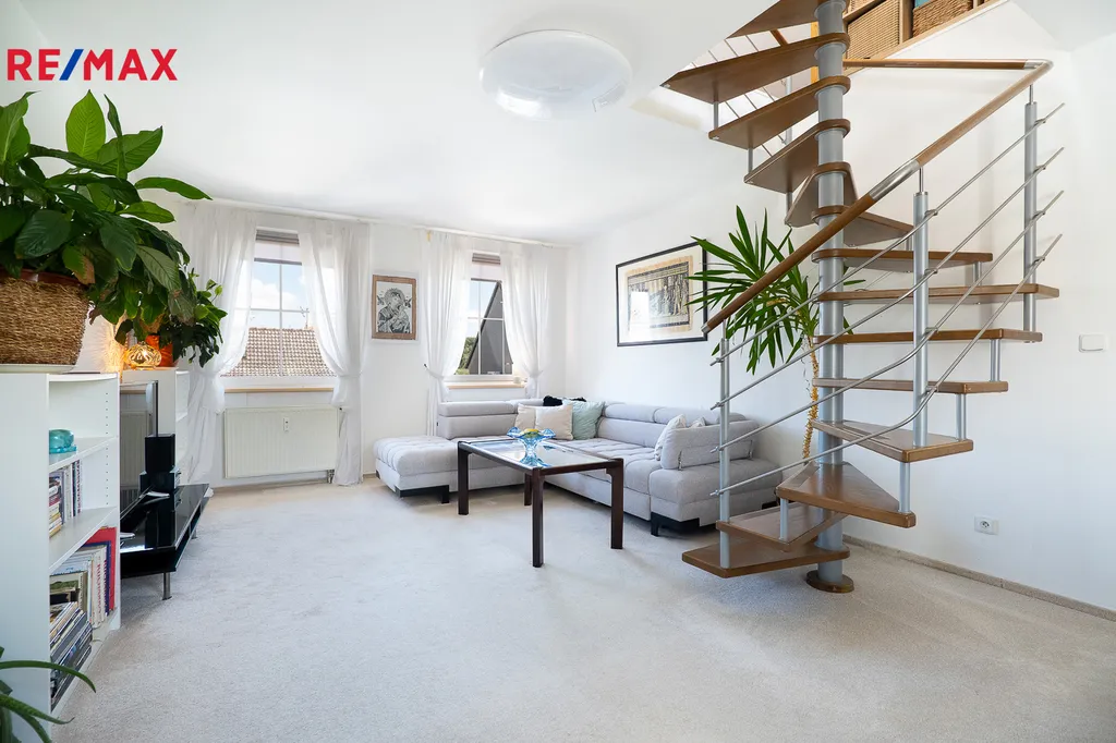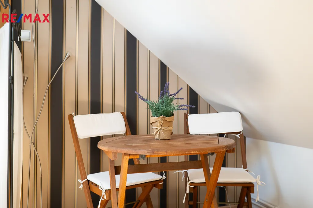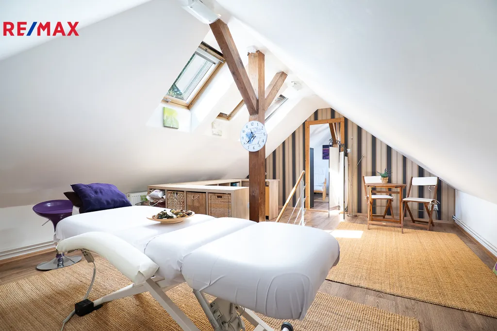 Dřevěné točité schodiště z masivního buku vede do podkroví, kde se nachází dvě ložnice, aktuálně využívané jako pracovna majitelky. Je zde možnost instalace druhé koupelny. Celková podlahová plocha podkroví je 39,7 m².