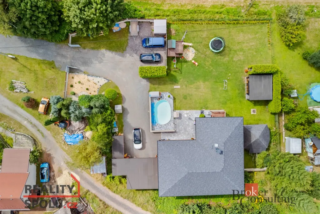 Samozřejmostí je garáž, kryté stání pro dva vozy a další parkovací místa přímo na pozemku. Vše přehledně, prakticky a bez kompromisů.