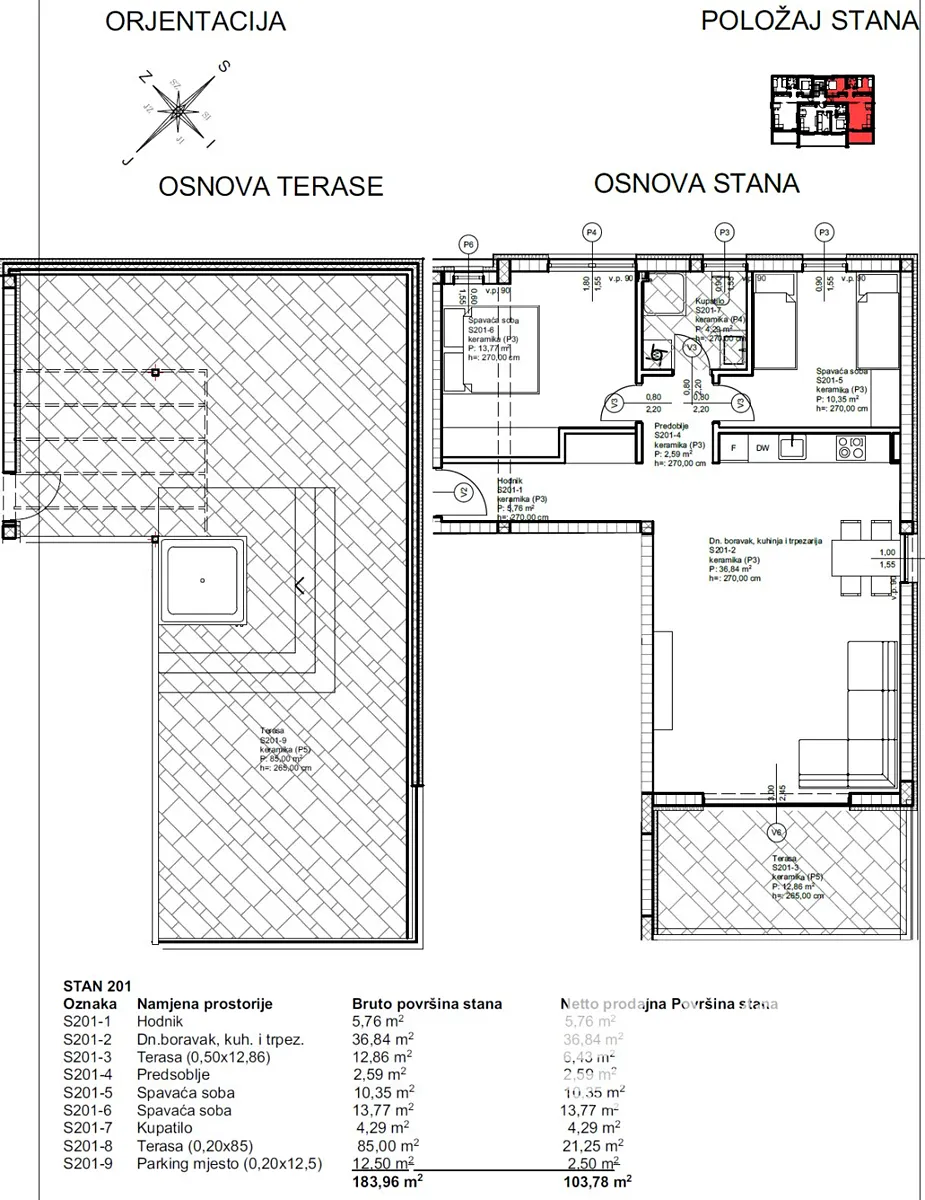 Apartmán se nachází ve druhém patře novostavby a rozprostírá se na ploše 80,03 m² čisté užitné plochy. Součástí bytu je vstupní chodba, dvě komfortní ložnice, elegantní koupelna, moderní kuchyně s jídelnou, světlý obývací pokoj a terasa s částečným výhledem na moře. Tím však nabídka nekončí – pravým skvostem této nemovitosti je soukromá střešní terasa, která je vybavena vířivkou a poskytuje naprosté soukromí i dechberoucí výhledy na Jadran a okolní krajinu.