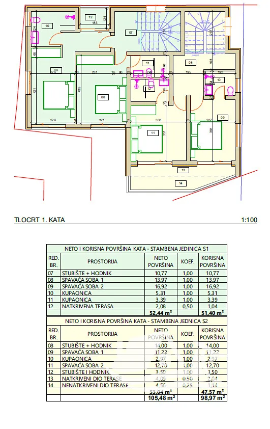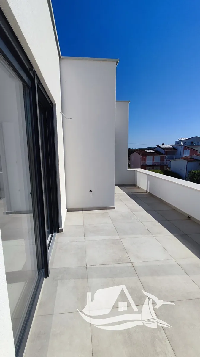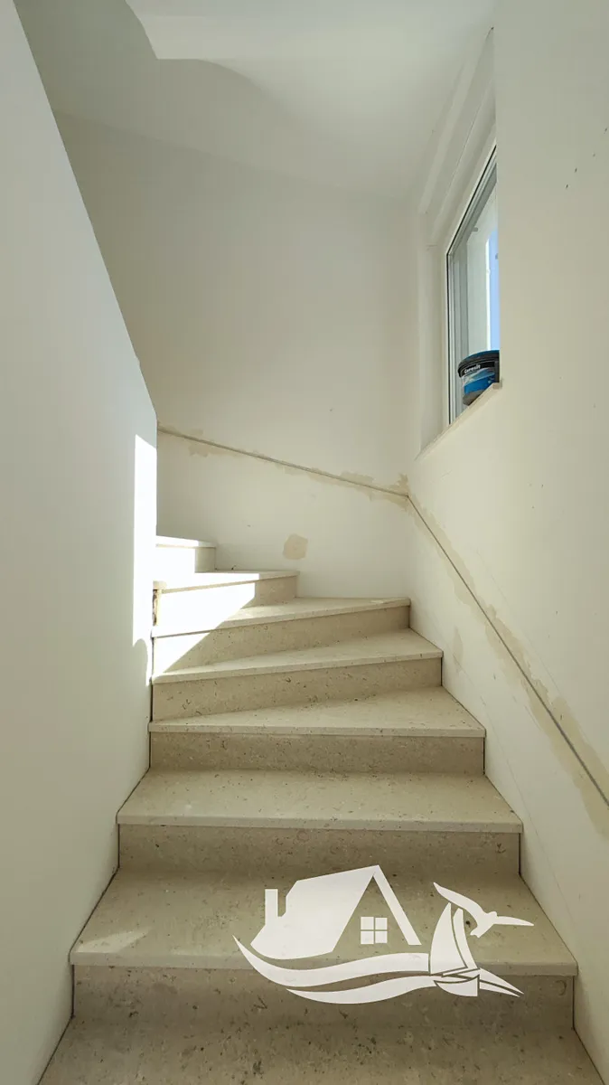 Vnitřním schodištěm se dostanete do prvního patra, kde jsou dvě ložnice, každá se svou vlastní koupelnou a přístupem na společnou terasu. Tento koncept zajišťuje maximální soukromí, ať už pro členy rodiny, nebo hosty, a zároveň umožňuje dostatek prostoru a vzdušnosti. Na druhém patře se nachází třetí ložnice, opět s koupelnou a výstupem na soukromou terasu o velikosti 17,31 m². A právě z této terasy je nádherný výhled na moře a okolní přírodu – klidné zelené pásy a středomořské domky, které vytváří atmosféru typickou pro Dalmácii.
