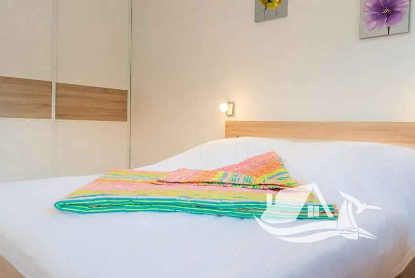 Dispozice bytu je navržena s důrazem na pohodlí a estetiku – obývací pokoj s otevřenou kuchyní a jídelním koutem je propojen s balkonem, ze kterého se otevírá dech beroucí výhled na moře. Ložnice je klidná a komfortní, vhodná pro každodenní bydlení i relaxaci během dovolené.