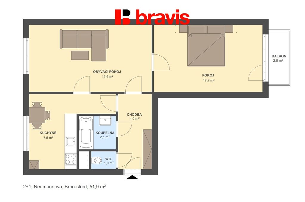 V zastoupení majitele nabízíme k pronájmu byt 2+1 o velikosti 52 m2 na prestižní adrese ulice Neumannova, Brno - Pisárky. Byt se nachází ve 2. patře cihlového domu, dispozici jsou také dva sklepy (2,5 a 1,5m2).
