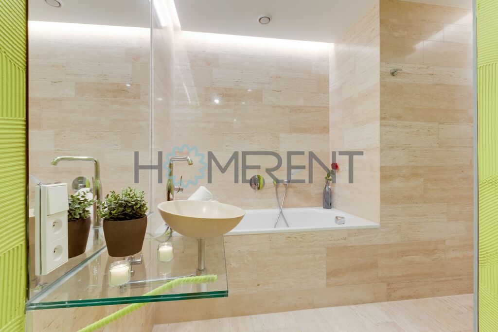 Koupelna je navržena ve světlém a elegantním stylu a nabízí jak prostornou vanu, tak i praktický sprchový kout. V chodbě bytu se nachází velké množství vestavěných úložných skříní, které zajistí, že budete mít vše přehledně uspořádané. Právě zde je také umístěna pračka se sušičkou.