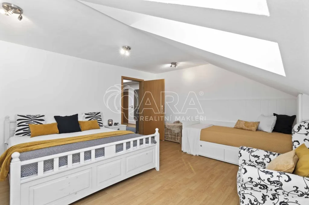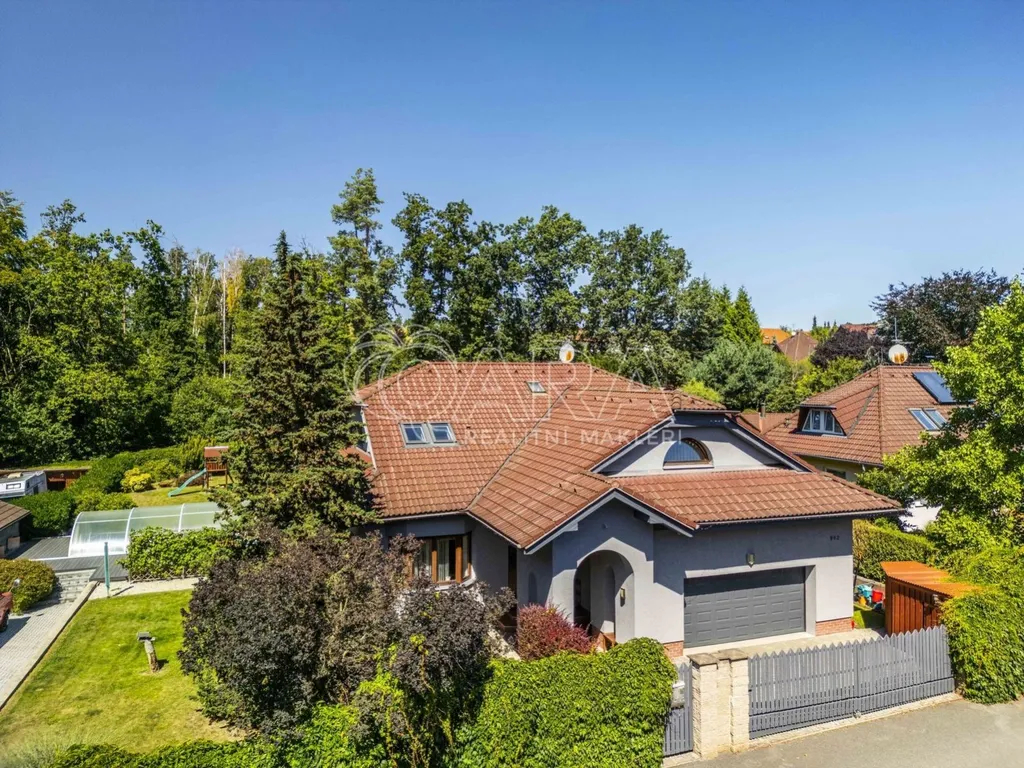 Pozemek o rozloze 1748 m obklopený lesem je víc než jen místo k posezení. Bazén, vířivka, pergola, venkovní krb s posezením, malé dětské hřiště, a pokud vám nestačí téměř čtyřicetimetrová uzavřená dvougaráž, protože máte trochu větší vozový park nebo třeba karavan, vejdete se na pozemek pohodlně i s vašimi dalšími motorovými mazlíčky. Všechno tu má svoje místo.