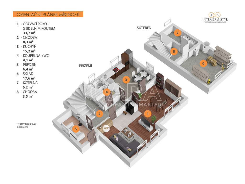 přízemí - prostorný obývací pokoj propojen s jídelnou 34m2, samostatná kuchyň včetně veškerých spotřebičů, koupelna + wc, chodba a zádveří, schody do prvního patra