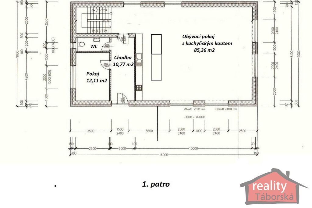 1. patro: chodba (10,77m2), obývací pokoj s kuchyňským koutem včetně spotřebičů (85,36m2), pokoj (12,11m2) a samostatná toaleta s umyvadlem (3,43m2).