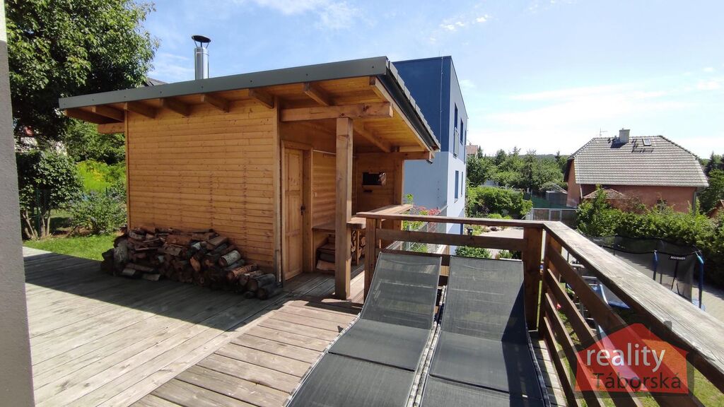 Součástí domu je samostatně stojící sauna (viz foto). Příjezd k domu od hlavní komunikace je ze zámkové dlažby s bránou na dálkové ovládání, která zajišťuje jak soukromí, tak bezpečnost pro děti hrající si u domu.