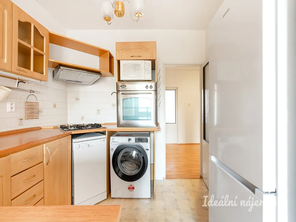 Kuchyně je vybavena troubou, myčkou, lednicí, digestoří a plynovým sporákem.