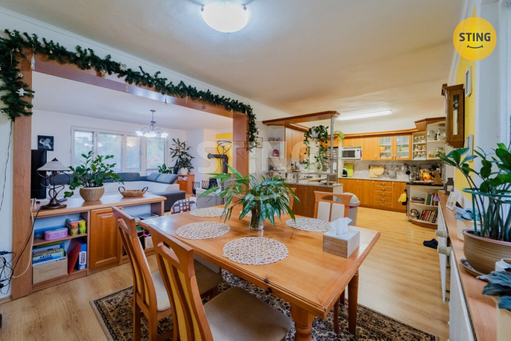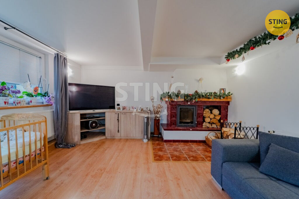 První patro: velká kuchyně propojená s jídelním koutem a plynule navazujícím prostorným obývacím pokojem s balkónem kde atmosféru domova doplňuje krb. Dále koupelna, samostatné WC, špajz a jeden pokoj.