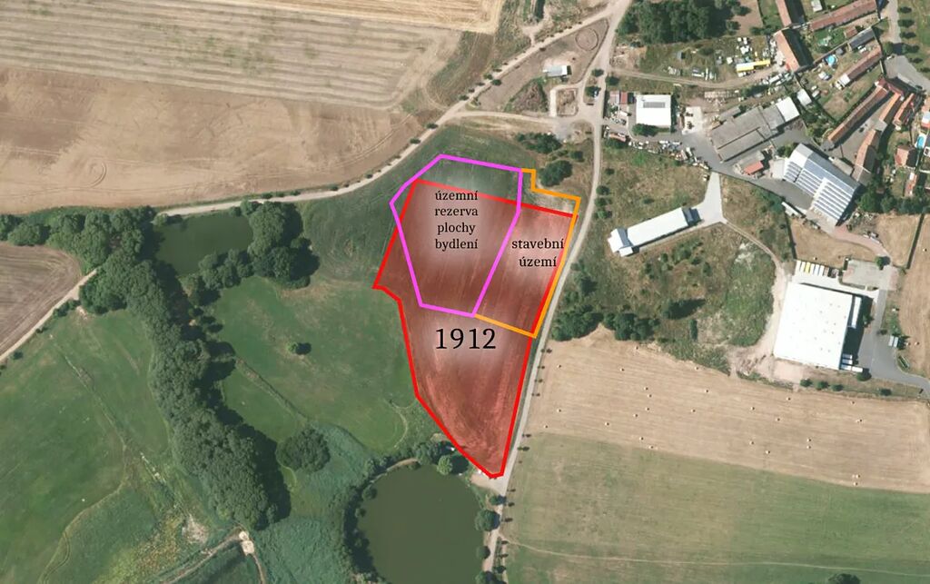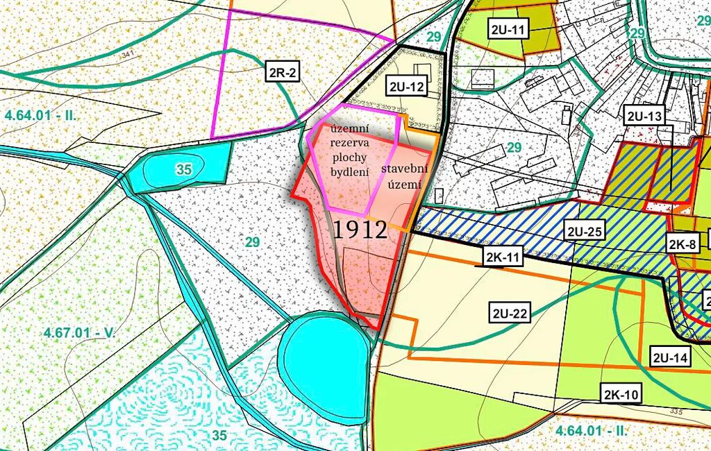 Parcela leží na jihozápadě obce. Ze své severní strany leží v ploše označené jako zastavitelná plocha smíšená - v prodeji se jedná asi o 244 m2. Současně leží v ploše, kterou obec rezervovala pro plochu bydlení - cca 590 m2. Uspořádání je k náhledu ve fotogalerii inzerce. Pozemek samotný je zobrazen červenou barvou, zastavitelné plochy růžovou respektive oranžovou, jak odpovídají zákresu v územním plánu obce.