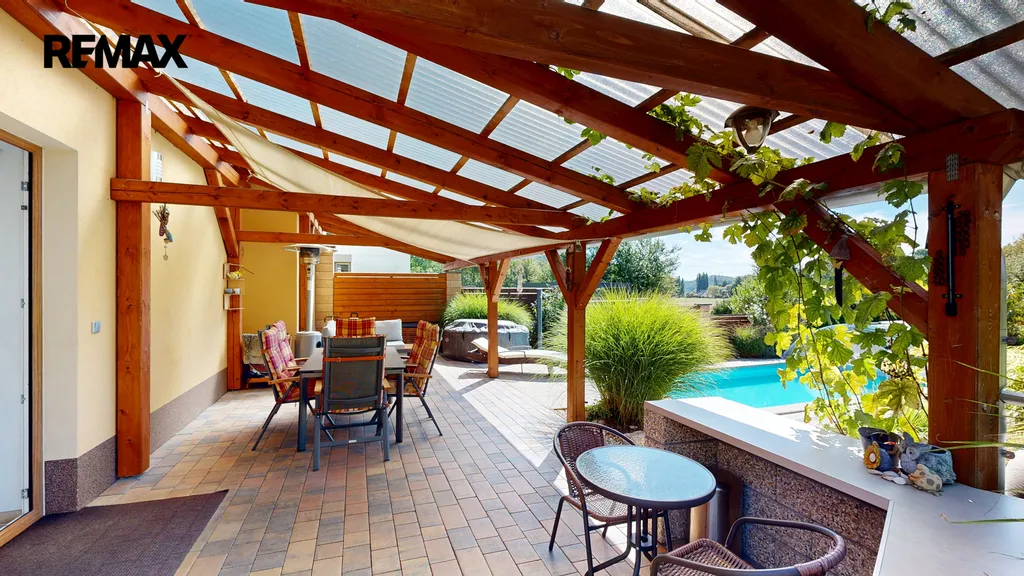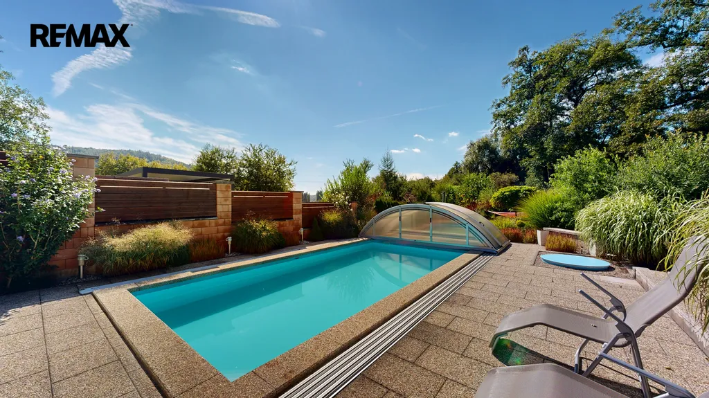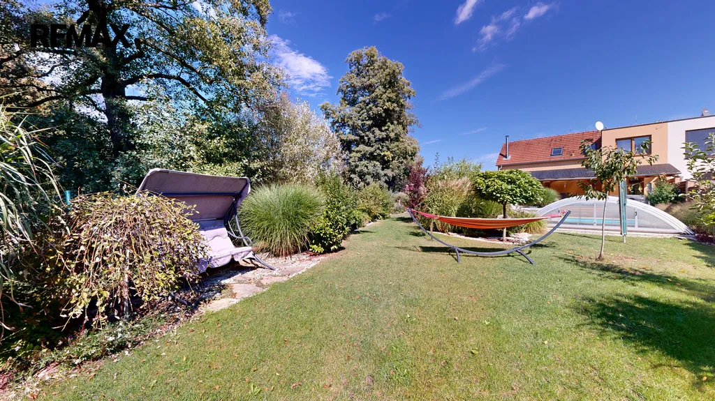 Na okrasné zahradě o výměře 306 m2 se nachází krytý bazén Albixon z roku 2020, o objemu 32 m3 ( hloubka 1,2 m, rozměry 3,5 x 7,5 m), na níž navazuje další část zahrady o výměře 500 m2, která je v dlouhodobém pronájmu od obce. Dále se na pozemku nachází kryté parkovací místo na auto o výměře 20 m2 a 2 zahradní domky na nářadí.