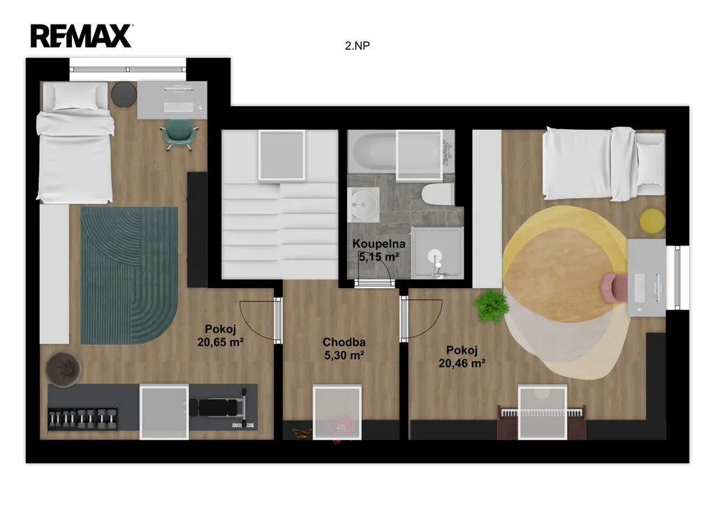 2.NP: schodiště 5,1 m2, chodba 5,3 m2, koupena s WC 5,2 m2, ložnice 20 m2, pokoj 21 m2.