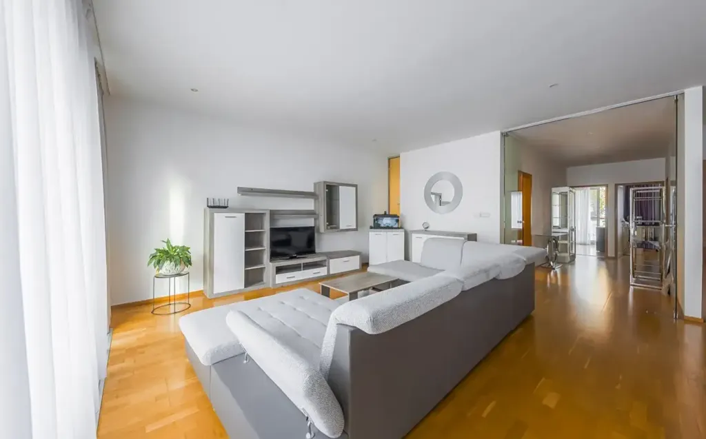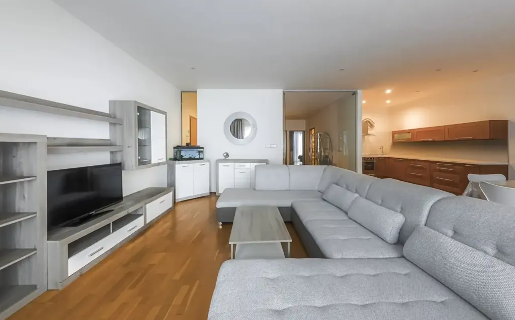Dominantou bytu je velkorysý obývací pokoj s plně vybavenou kuchyňskou linkou (včetně všech spotřebičů) a jídelní částí. Celý prostor je díky velkým francouzským oknům nádherně prosvětlený a nabízí výhled do klidné zeleně.