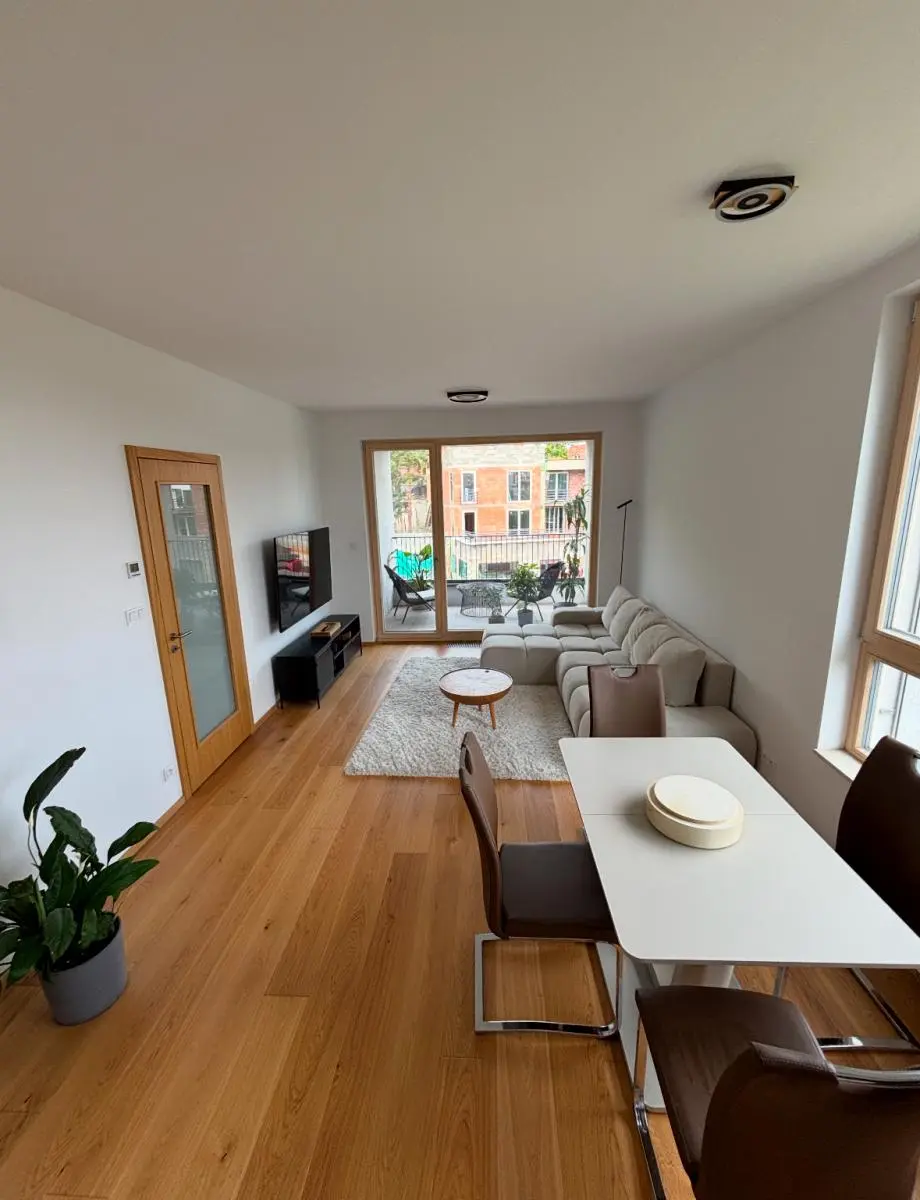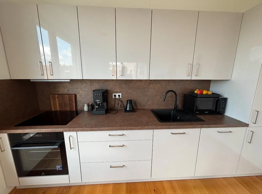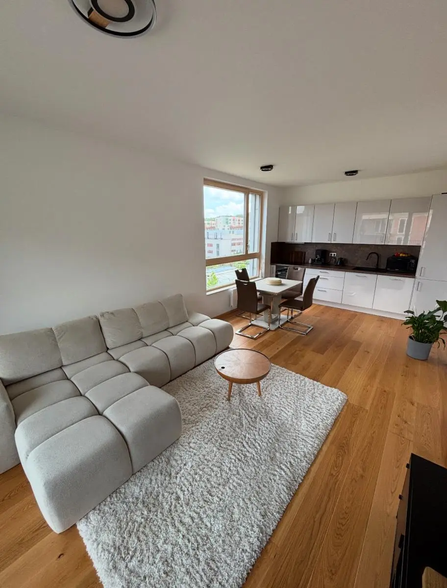 Tento světlý a vzdušný byt zaujme nejen skvělým dispozičním řešením, ale i kvalitním vybavením a příjemnou atmosférou. Dominantou interiéru je prostorný obývací pokoj s TV, s na míru vyrobenou kuchyňskou linkou plně vybavenou moderními spotřebiči včetně mikrovlnky, myčky nádobí . Z obývacího pokoje vedou francouzská okna na zasklenou lodžii, ideální pro ranní kávu, večerní relax nebo třeba městskou mini zahrádku.