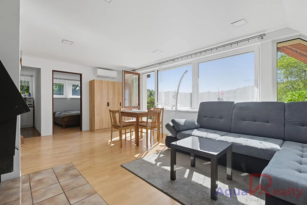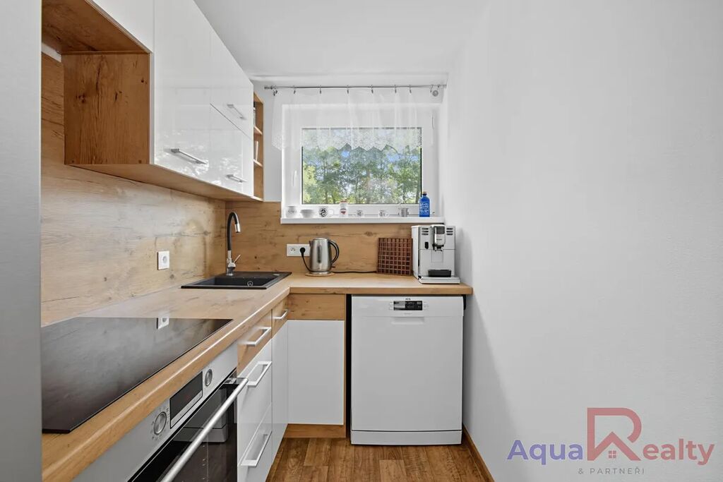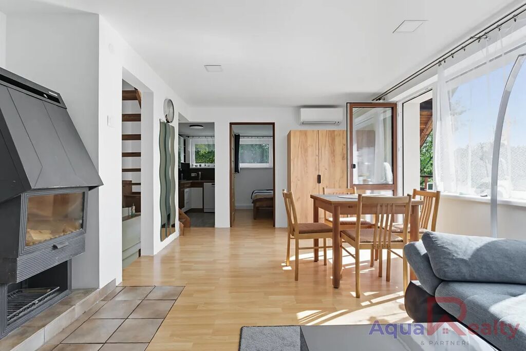 Interiér je kompletně zařízený a vybavený krbem, který se postará o příjemnou atmosféru zejména v zimních měsících. K dispozici je koupelna se sprchovým koutem a samostatná toaleta, velkou předností je také slunný balkon s krásným výhledem na zeleň, řeku Ohři a rozhlednu Bučina. Kuchyň je samostatná a plně vybavena kvalitními spotřebiči, mezi které patří velká lednice s mrazákem značky Samsung, indukční varná deska Mora, elektrická trouba a myčka AEG. Díky tomu je připravena na každodenní vaření i pohodlný provoz pro celou rodinu, zatímco obývací pokoj zůstává samostatným prostorem určeným k odpočinku a setkávání u krbu.