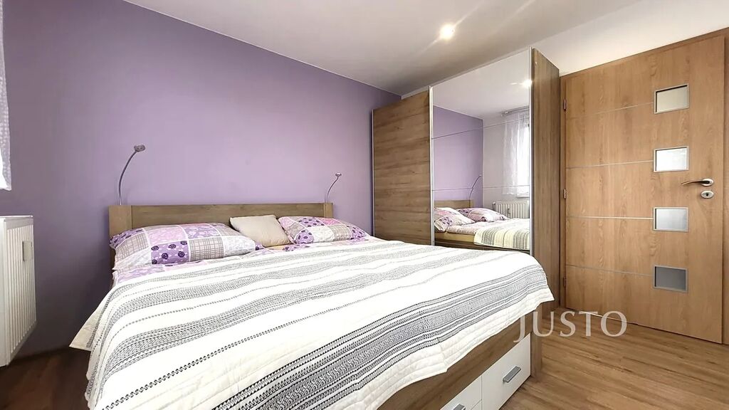 Ložnice s balkonem je vybavena manželským dvojlůžkem, šatní skříní a komodami pro uložení všeho potřebného. V letních měsících Vás jistě potěší klimatizace, která je umístěna v ložnici. Pohodlně však upraví teplotu v obou obytných místnostech.