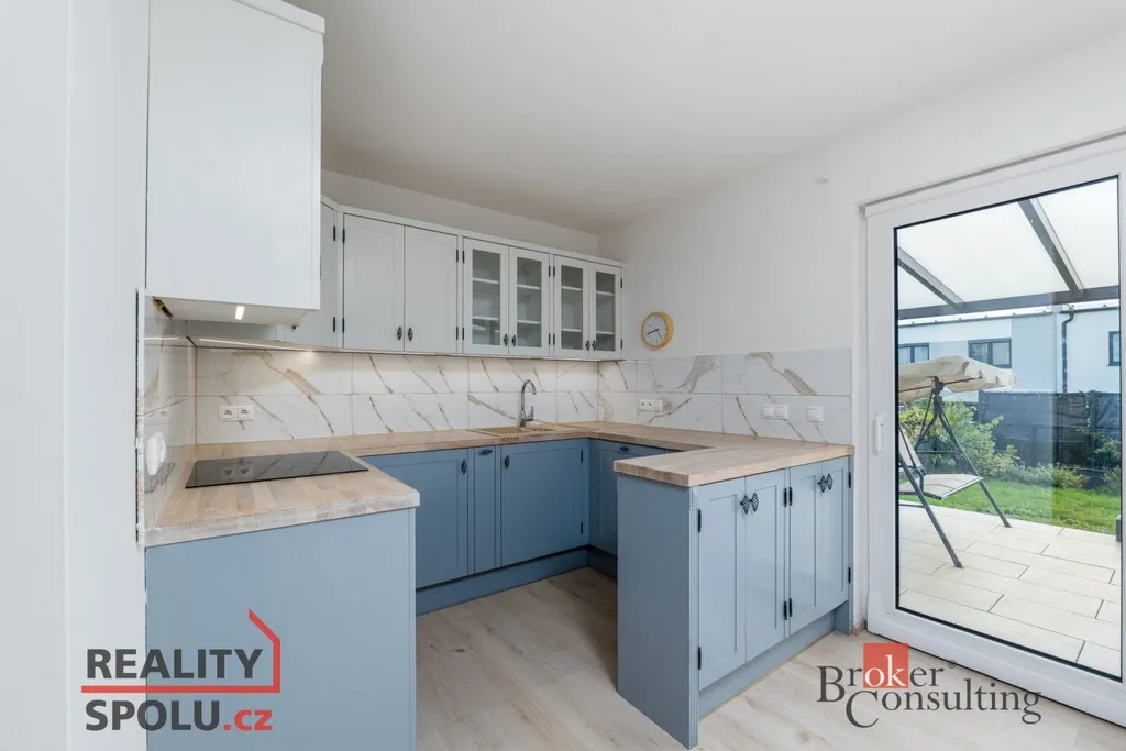 Dominantou domu je světlý obývací pokoj s krbem, který navazuje na moderní kuchyňský kout a přímý vstup na terasu se zahradou. Terasa je ideálním místem pro odpočinek i posezení s přáteli.