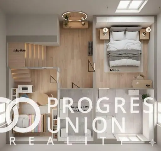 Patro: jeden menší a jeden větší pokoj, koupelna se sprchovým koutem, WC a přípravou na pračku.
