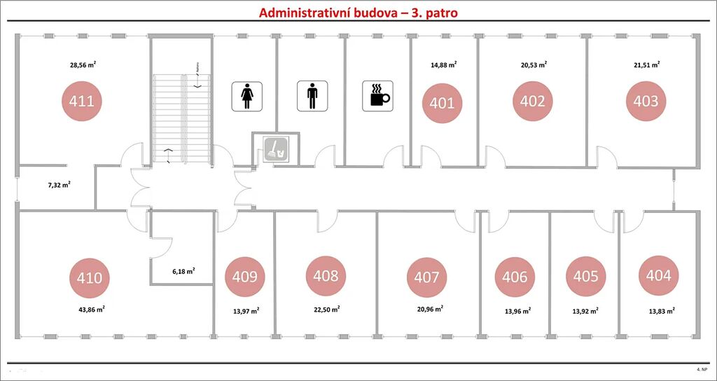 3x samostatná kancelář s výměrou od 14m2 do 22m2 (č.402,403,405)